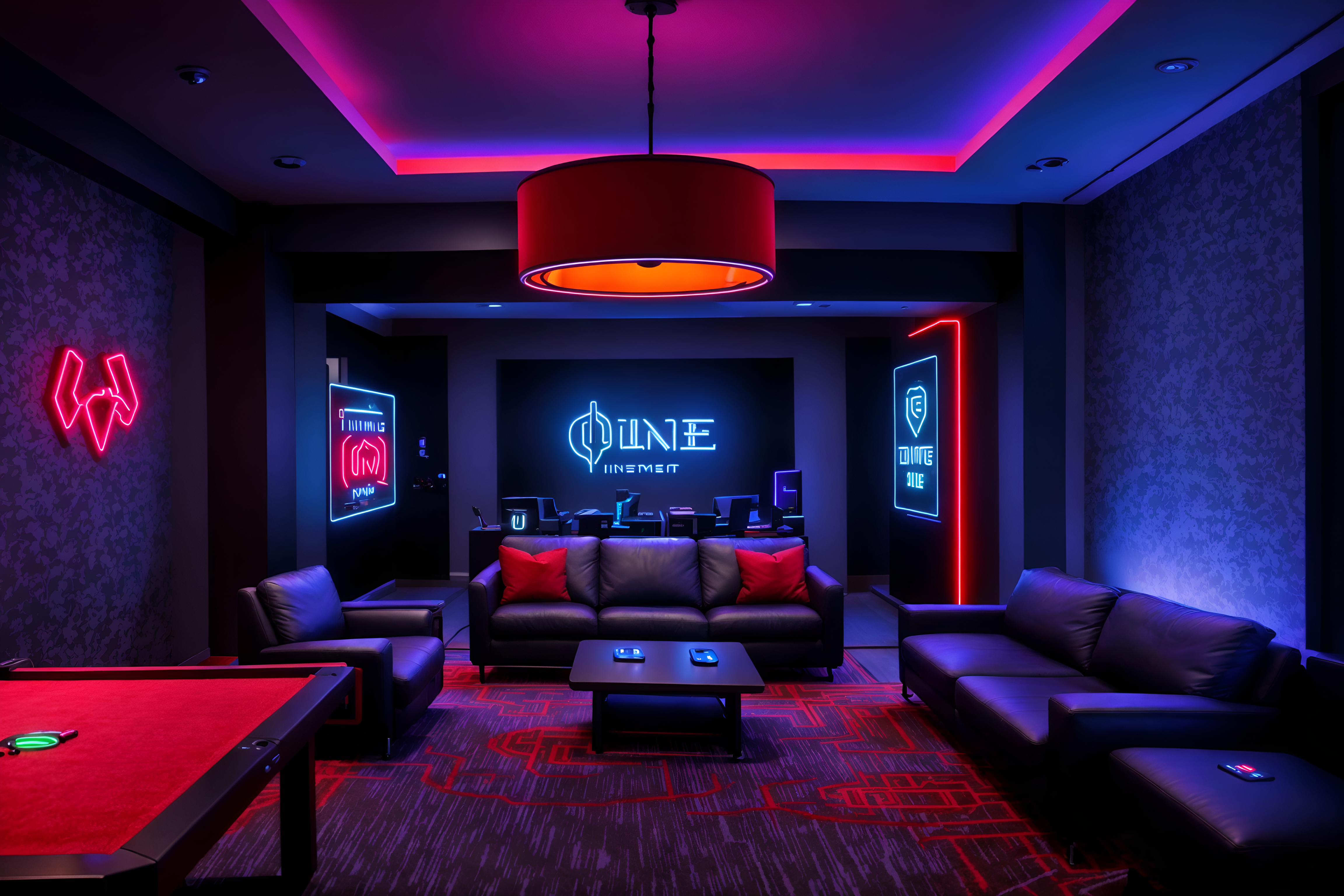photo from pinterest of gaming room-style interior designed (hotel lobby interior) with rug and furniture and hanging lamps and sofas and plant and check in desk and coffee tables and lounge chairs. . with dark walls and multiple displays and neon letters on wall and computer desk with computer displays and keyboard and gaming chair and purple, red and blue fade light and purple and red lights and speakers. . cinematic photo, highly detailed, cinematic lighting, ultra-detailed, ultrarealistic, photorealism, 8k. trending on pinterest. gaming room interior design style. masterpiece, cinematic light, ultrarealistic+, photorealistic+, 8k, raw photo, realistic, sharp focus on eyes, (symmetrical eyes), (intact eyes), hyperrealistic, highest quality, best quality, , highly detailed, masterpiece, best quality, extremely detailed 8k wallpaper, masterpiece, best quality, ultra-detailed, best shadow, detailed background, detailed face, detailed eyes, high contrast, best illumination, detailed face, dulux, caustic, dynamic angle, detailed glow. dramatic lighting. highly detailed, insanely detailed hair, symmetrical, intricate details, professionally retouched, 8k high definition. strong bokeh. award winning photo.