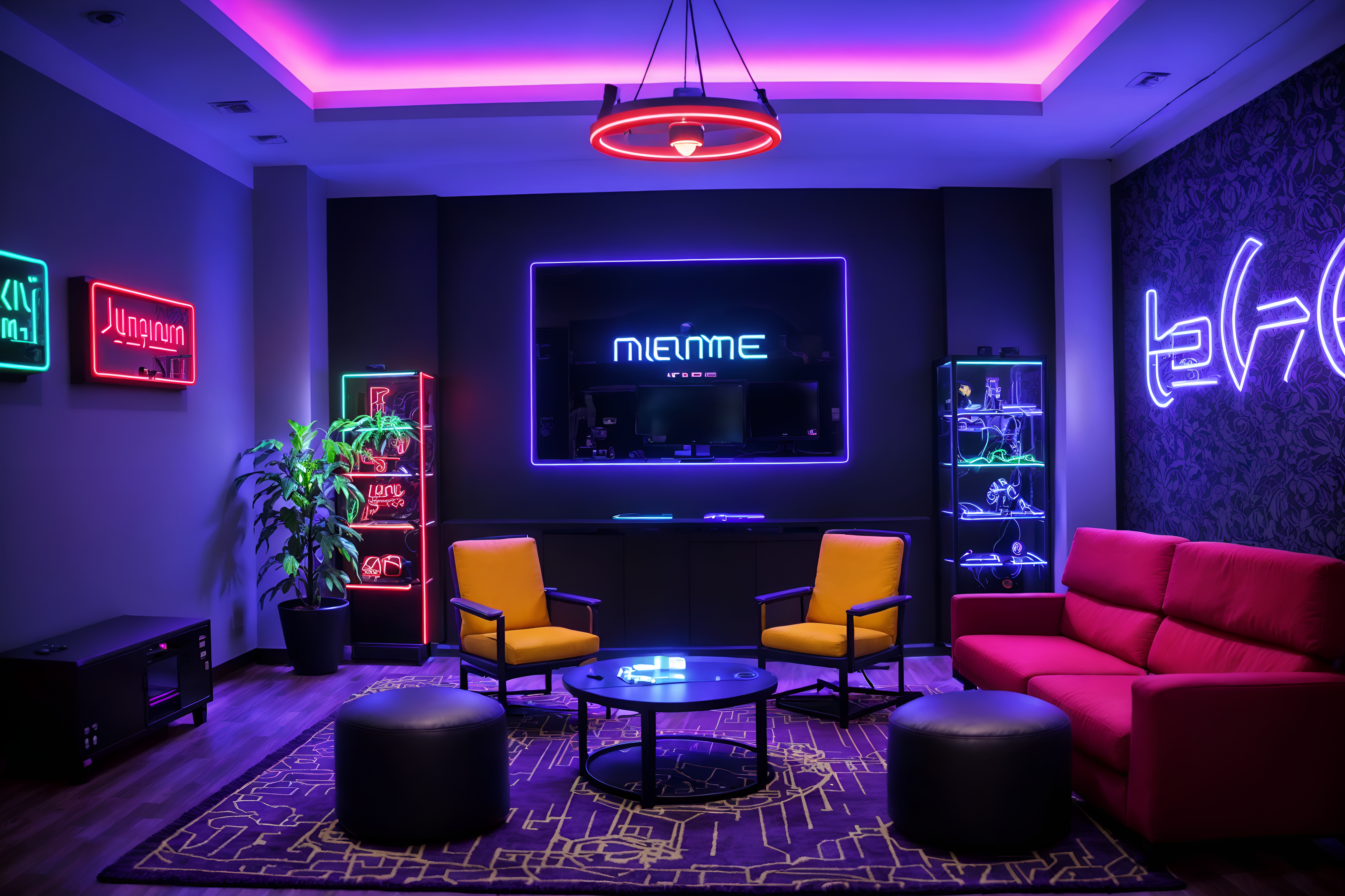 photo from pinterest of gaming room-style interior designed (hotel lobby interior) with rug and furniture and hanging lamps and sofas and plant and check in desk and coffee tables and lounge chairs. . with dark walls and multiple displays and neon letters on wall and computer desk with computer displays and keyboard and gaming chair and purple, red and blue fade light and purple and red lights and speakers. . cinematic photo, highly detailed, cinematic lighting, ultra-detailed, ultrarealistic, photorealism, 8k. trending on pinterest. gaming room interior design style. masterpiece, cinematic light, ultrarealistic+, photorealistic+, 8k, raw photo, realistic, sharp focus on eyes, (symmetrical eyes), (intact eyes), hyperrealistic, highest quality, best quality, , highly detailed, masterpiece, best quality, extremely detailed 8k wallpaper, masterpiece, best quality, ultra-detailed, best shadow, detailed background, detailed face, detailed eyes, high contrast, best illumination, detailed face, dulux, caustic, dynamic angle, detailed glow. dramatic lighting. highly detailed, insanely detailed hair, symmetrical, intricate details, professionally retouched, 8k high definition. strong bokeh. award winning photo.
