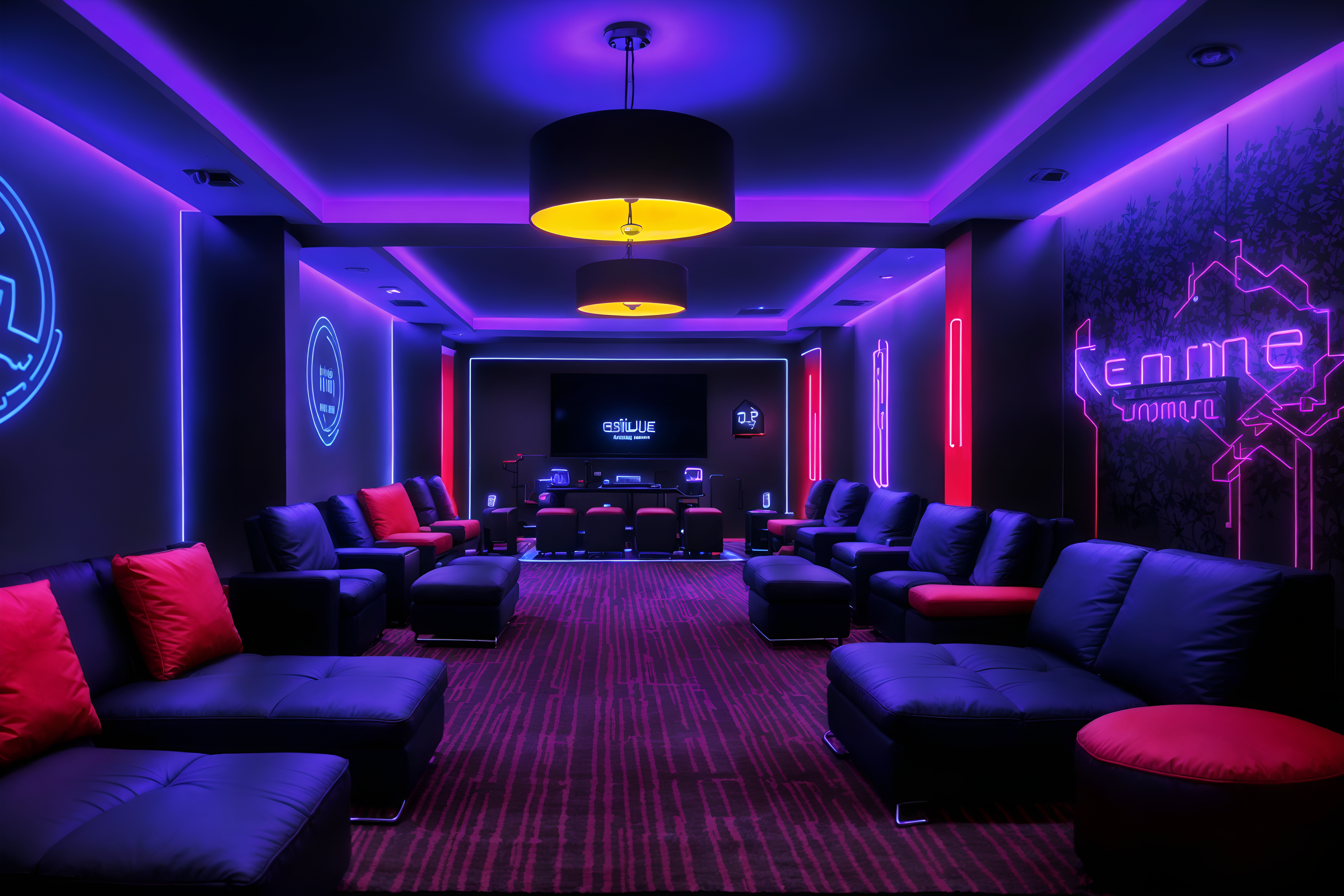 photo from pinterest of gaming room-style interior designed (hotel lobby interior) with rug and furniture and hanging lamps and sofas and plant and check in desk and coffee tables and lounge chairs. . with dark walls and multiple displays and neon letters on wall and computer desk with computer displays and keyboard and gaming chair and purple, red and blue fade light and purple and red lights and speakers. . cinematic photo, highly detailed, cinematic lighting, ultra-detailed, ultrarealistic, photorealism, 8k. trending on pinterest. gaming room interior design style. masterpiece, cinematic light, ultrarealistic+, photorealistic+, 8k, raw photo, realistic, sharp focus on eyes, (symmetrical eyes), (intact eyes), hyperrealistic, highest quality, best quality, , highly detailed, masterpiece, best quality, extremely detailed 8k wallpaper, masterpiece, best quality, ultra-detailed, best shadow, detailed background, detailed face, detailed eyes, high contrast, best illumination, detailed face, dulux, caustic, dynamic angle, detailed glow. dramatic lighting. highly detailed, insanely detailed hair, symmetrical, intricate details, professionally retouched, 8k high definition. strong bokeh. award winning photo.