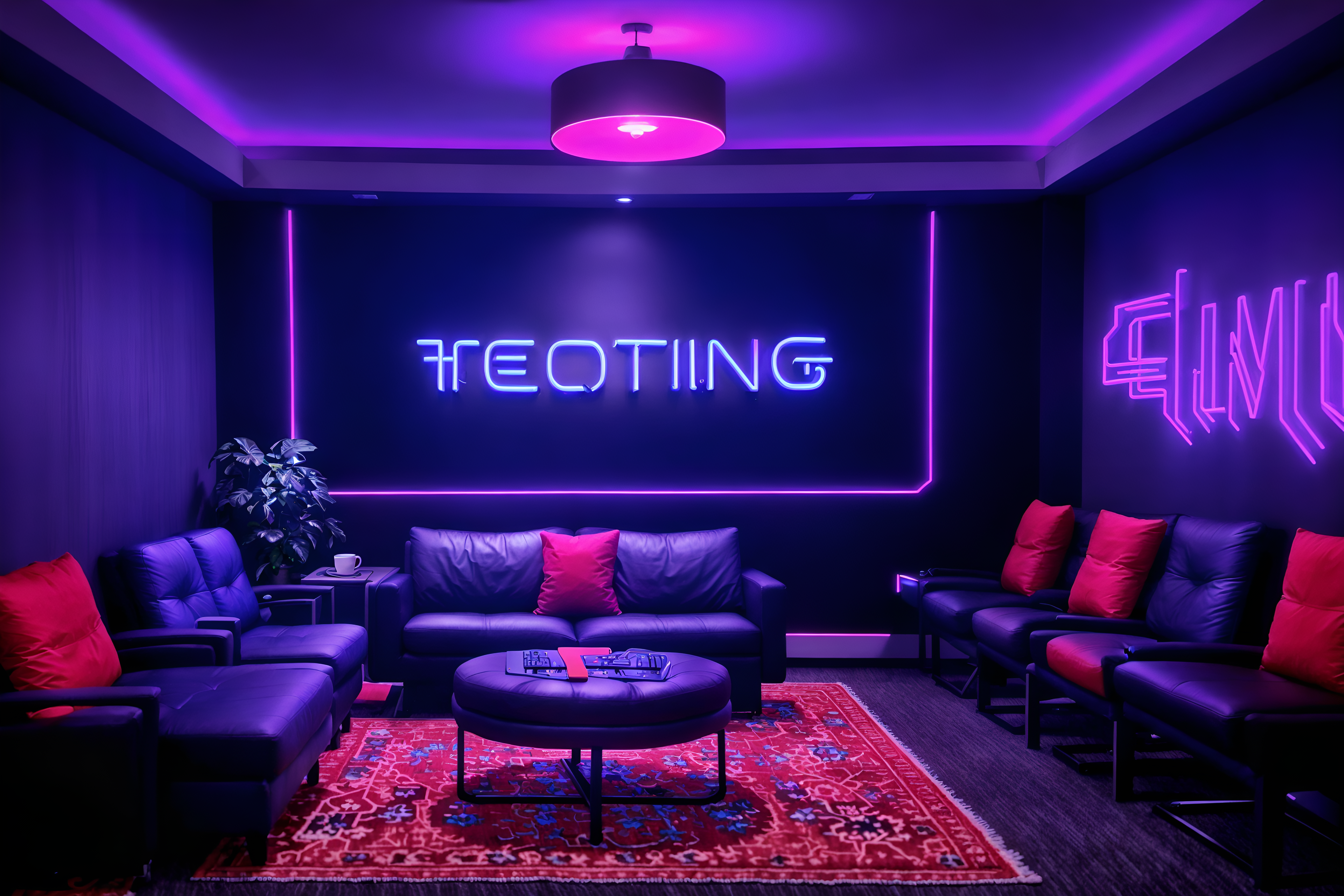photo from pinterest of gaming room-style interior designed (hotel lobby interior) with rug and furniture and hanging lamps and sofas and plant and check in desk and coffee tables and lounge chairs. . with dark walls and multiple displays and neon letters on wall and computer desk with computer displays and keyboard and gaming chair and purple, red and blue fade light and purple and red lights and speakers. . cinematic photo, highly detailed, cinematic lighting, ultra-detailed, ultrarealistic, photorealism, 8k. trending on pinterest. gaming room interior design style. masterpiece, cinematic light, ultrarealistic+, photorealistic+, 8k, raw photo, realistic, sharp focus on eyes, (symmetrical eyes), (intact eyes), hyperrealistic, highest quality, best quality, , highly detailed, masterpiece, best quality, extremely detailed 8k wallpaper, masterpiece, best quality, ultra-detailed, best shadow, detailed background, detailed face, detailed eyes, high contrast, best illumination, detailed face, dulux, caustic, dynamic angle, detailed glow. dramatic lighting. highly detailed, insanely detailed hair, symmetrical, intricate details, professionally retouched, 8k high definition. strong bokeh. award winning photo.