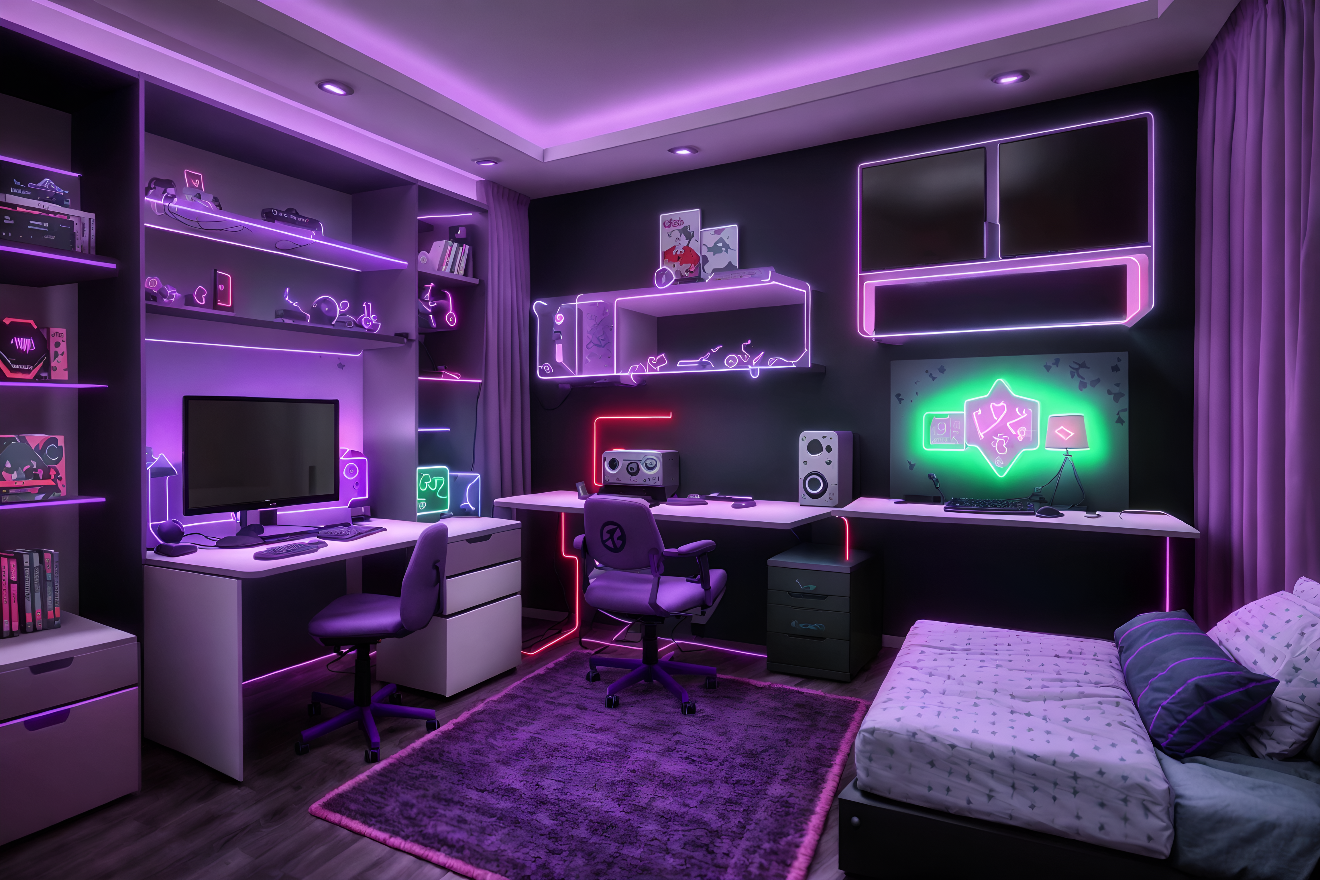 photo from pinterest of gaming room-style interior designed (kids room interior) with kids desk and bed and accent chair and mirror and dresser closet and storage bench or ottoman and night light and plant. . with dark walls and neon lights and purple, red and blue fade light and purple and red lights and gaming chair and at night and computer desk with computer displays and keyboard and speakers. . cinematic photo, highly detailed, cinematic lighting, ultra-detailed, ultrarealistic, photorealism, 8k. trending on pinterest. gaming room interior design style. masterpiece, cinematic light, ultrarealistic+, photorealistic+, 8k, raw photo, realistic, sharp focus on eyes, (symmetrical eyes), (intact eyes), hyperrealistic, highest quality, best quality, , highly detailed, masterpiece, best quality, extremely detailed 8k wallpaper, masterpiece, best quality, ultra-detailed, best shadow, detailed background, detailed face, detailed eyes, high contrast, best illumination, detailed face, dulux, caustic, dynamic angle, detailed glow. dramatic lighting. highly detailed, insanely detailed hair, symmetrical, intricate details, professionally retouched, 8k high definition. strong bokeh. award winning photo.