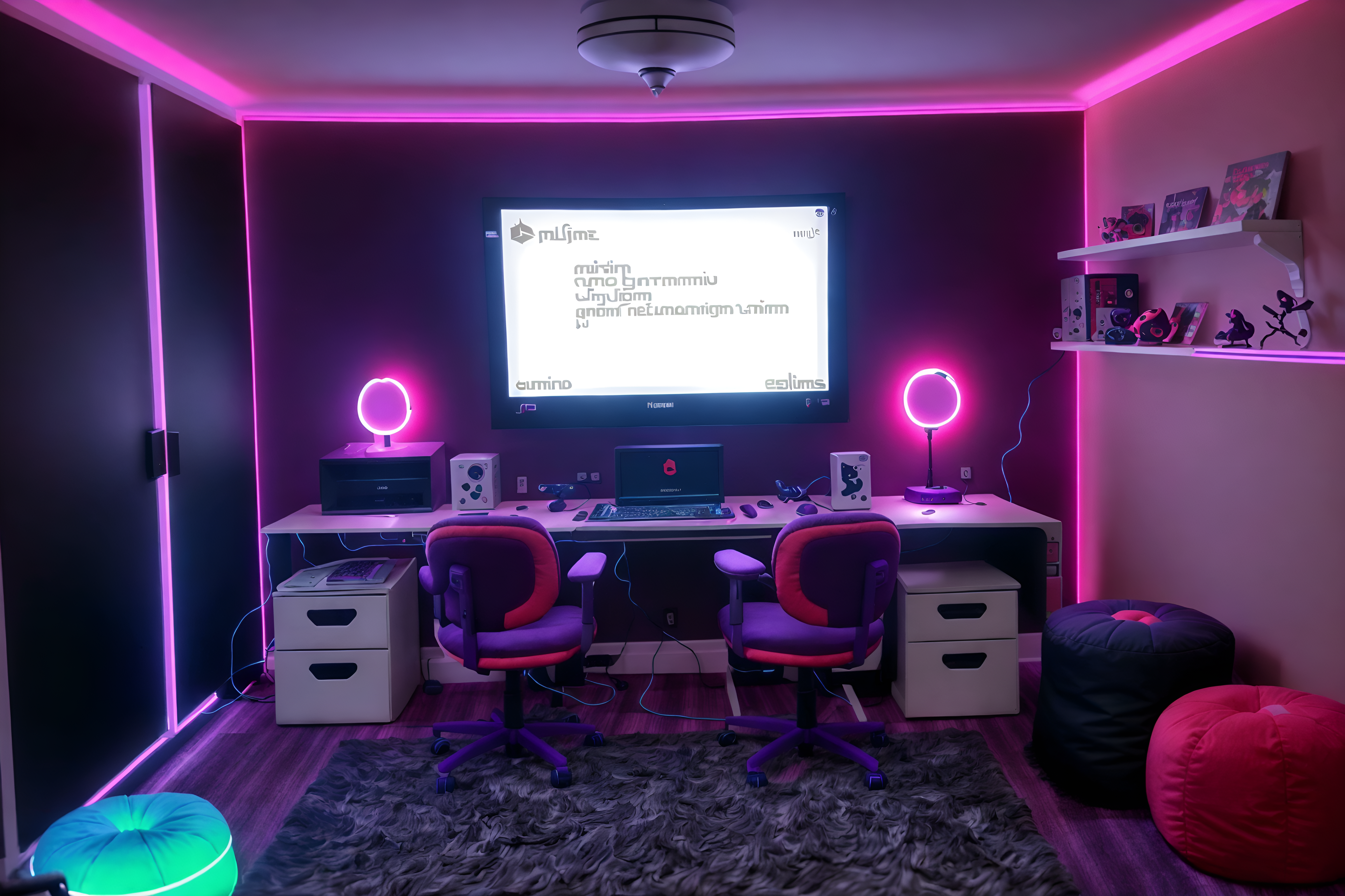 gaming room interiorsinterior decorate this parliament with gaming room style. . . with voting buttons and coat of arms and parliamentary seats and speaker podium and hansard reporters and gallery seating and flags and ceremonial mace. . with purple, red and blue fade light and video game consoles and speakers and dark room and multiple displays and purple and red lights and computer desk with computer displays and keyboard and neon letters on wall. . .interior decorate this coffee shop with gaming room style. . . . with at night and gaming chair and multiple displays and dark walls and purple and red lights and speakers and video game consoles and dark room. . .interior decorate this clothing store with gaming room style. . . . with video game consoles and dark lit room and neon letters on wall and purple, red and blue fade light and at night and dark room and dark walls and multiple displays. . .interior decorate this workshop with gaming room style. . . with tool wall and messy and wooden workbench and tool wall. . with dark walls and purple, red and blue fade light and computer desk with computer displays and keyboard and dark room and neon letters on wall and at night and gaming chair and speakers. . .interior decorate this outdoor garden with gaming room style. . . with garden plants and garden tree and grass and garden plants. . with neon letters on wall and video game consoles and multiple displays and dark room and dark lit room and gaming chair and dark walls and purple and red lights. . .interior decorate this music stage with gaming room style. . . with guitar stands and backdrop and amplifiers and stage lights and sound mixing board and drum kit and stage monitors and cables. . with computer desk with computer displays and keyboard and multiple displays and dark walls and purple, red and blue fade light and gaming chair and video game consoles and neon lights and speakers. . .interior decorate this temple with gaming room style. . . with meditation cushions and altar and prayer wheels and incense burner and sacred texts and bells and prayer flags and offerings bowl. . with dark walls and computer desk with computer displays and keyboard and purple, red and blue fade light and dark room and speakers and video game consoles and dark lit room and neon lights. . .interior decorate this gallery with gaming room style. . . with artwork and white walls and track lighting and spotlights and information plaques and exhibition catalogs and pedestals and benches. . with dark walls and dark lit room and multiple displays and dark room and computer desk with computer displays and keyboard and video game consoles and purple and red lights and gaming chair. . .interior decorate this hotel lobby with gaming room style. . . with rug and sofas and furniture and lounge chairs and check in desk and coffee tables and hanging lamps and plant. . with neon letters on wall and neon lights and dark lit room and multiple displays and purple and red lights and dark room and speakers and purple, red and blue fade light. . .