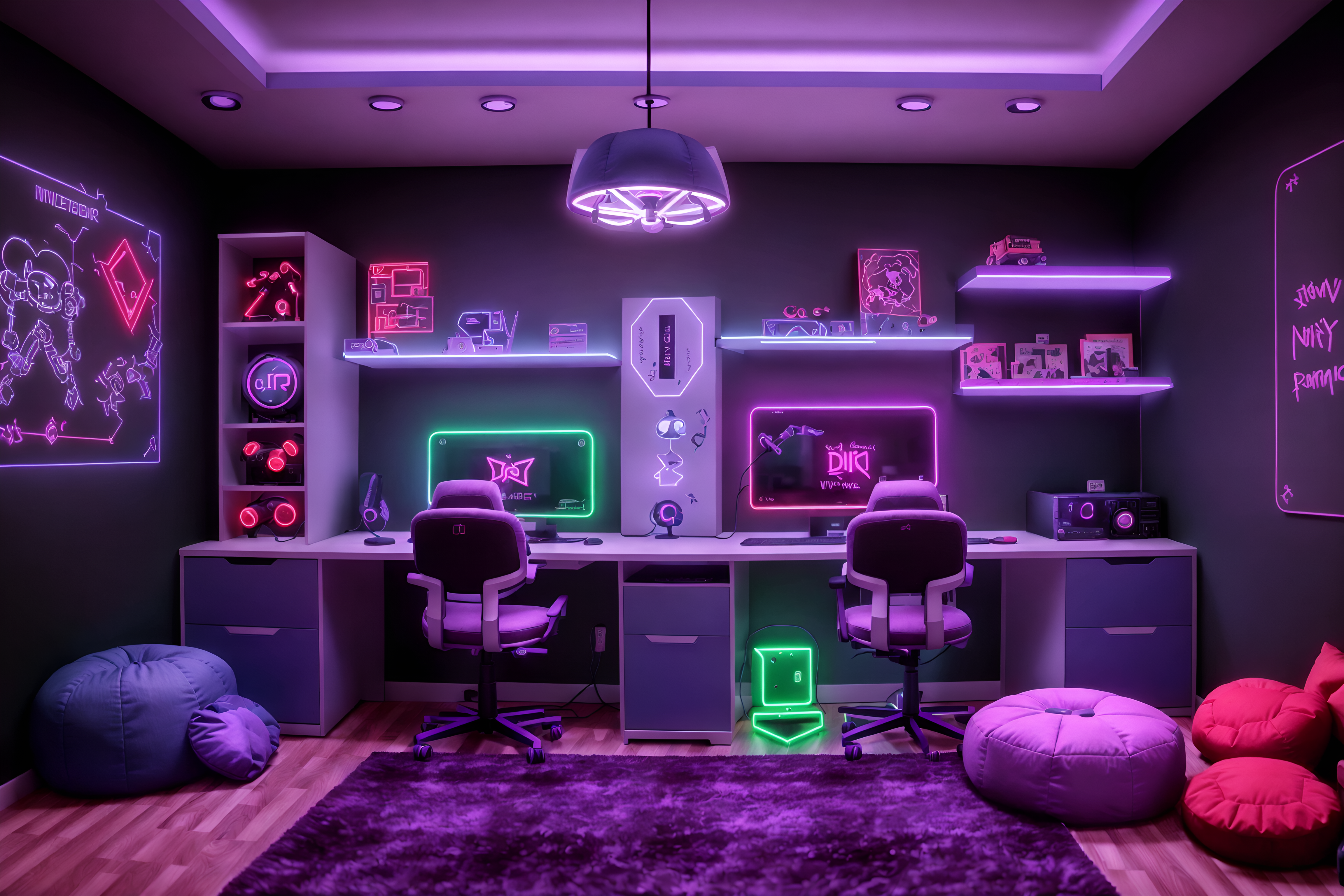 photo from pinterest of gaming room-style interior designed (kids room interior) with kids desk and bed and accent chair and mirror and dresser closet and storage bench or ottoman and night light and plant. . with dark walls and neon lights and purple, red and blue fade light and purple and red lights and gaming chair and at night and computer desk with computer displays and keyboard and speakers. . cinematic photo, highly detailed, cinematic lighting, ultra-detailed, ultrarealistic, photorealism, 8k. trending on pinterest. gaming room interior design style. masterpiece, cinematic light, ultrarealistic+, photorealistic+, 8k, raw photo, realistic, sharp focus on eyes, (symmetrical eyes), (intact eyes), hyperrealistic, highest quality, best quality, , highly detailed, masterpiece, best quality, extremely detailed 8k wallpaper, masterpiece, best quality, ultra-detailed, best shadow, detailed background, detailed face, detailed eyes, high contrast, best illumination, detailed face, dulux, caustic, dynamic angle, detailed glow. dramatic lighting. highly detailed, insanely detailed hair, symmetrical, intricate details, professionally retouched, 8k high definition. strong bokeh. award winning photo.