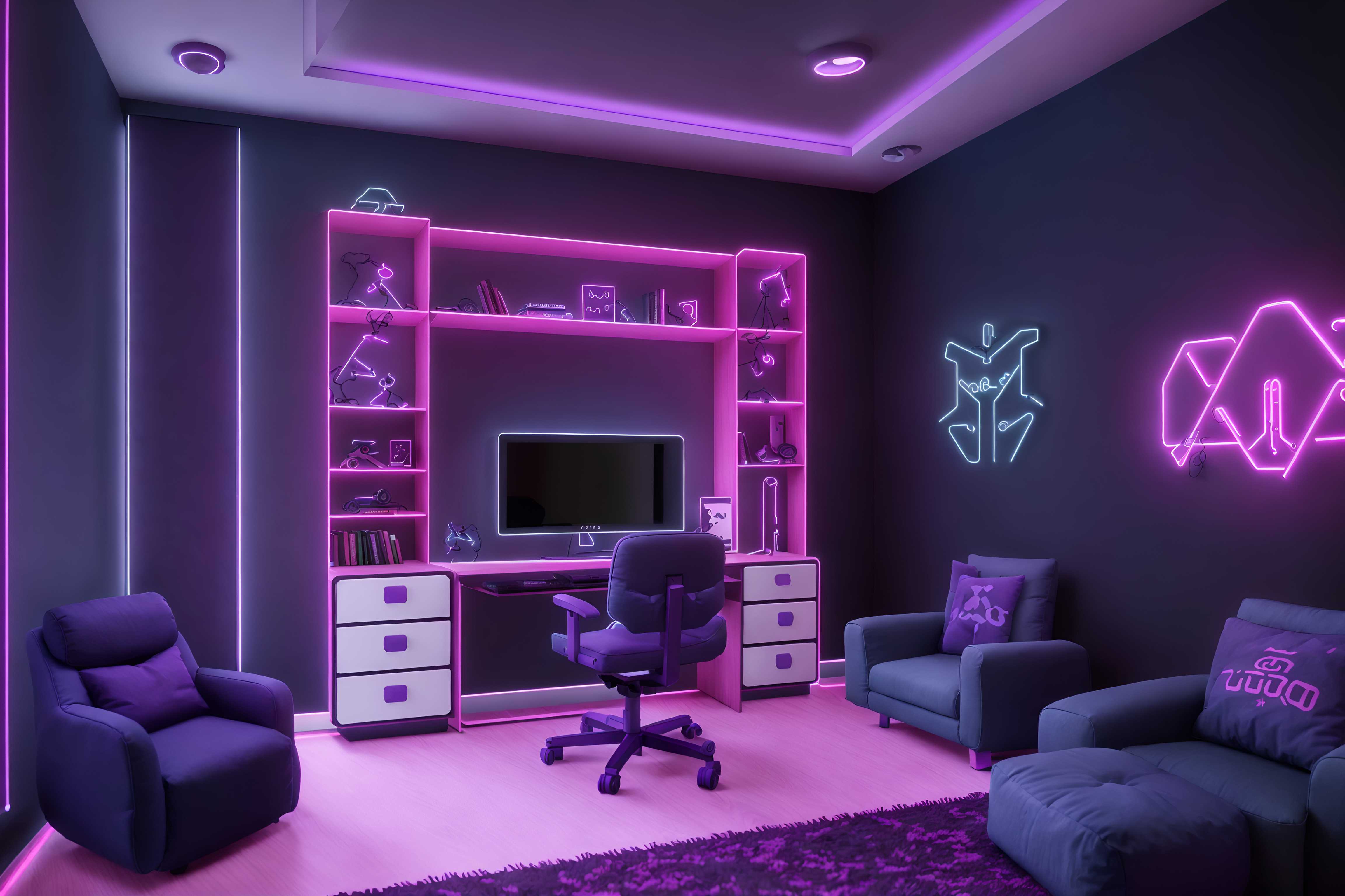 photo from pinterest of gaming room-style interior designed (kids room interior) with kids desk and bed and accent chair and mirror and dresser closet and storage bench or ottoman and night light and plant. . with dark walls and neon lights and purple, red and blue fade light and purple and red lights and gaming chair and at night and computer desk with computer displays and keyboard and speakers. . cinematic photo, highly detailed, cinematic lighting, ultra-detailed, ultrarealistic, photorealism, 8k. trending on pinterest. gaming room interior design style. masterpiece, cinematic light, ultrarealistic+, photorealistic+, 8k, raw photo, realistic, sharp focus on eyes, (symmetrical eyes), (intact eyes), hyperrealistic, highest quality, best quality, , highly detailed, masterpiece, best quality, extremely detailed 8k wallpaper, masterpiece, best quality, ultra-detailed, best shadow, detailed background, detailed face, detailed eyes, high contrast, best illumination, detailed face, dulux, caustic, dynamic angle, detailed glow. dramatic lighting. highly detailed, insanely detailed hair, symmetrical, intricate details, professionally retouched, 8k high definition. strong bokeh. award winning photo.
