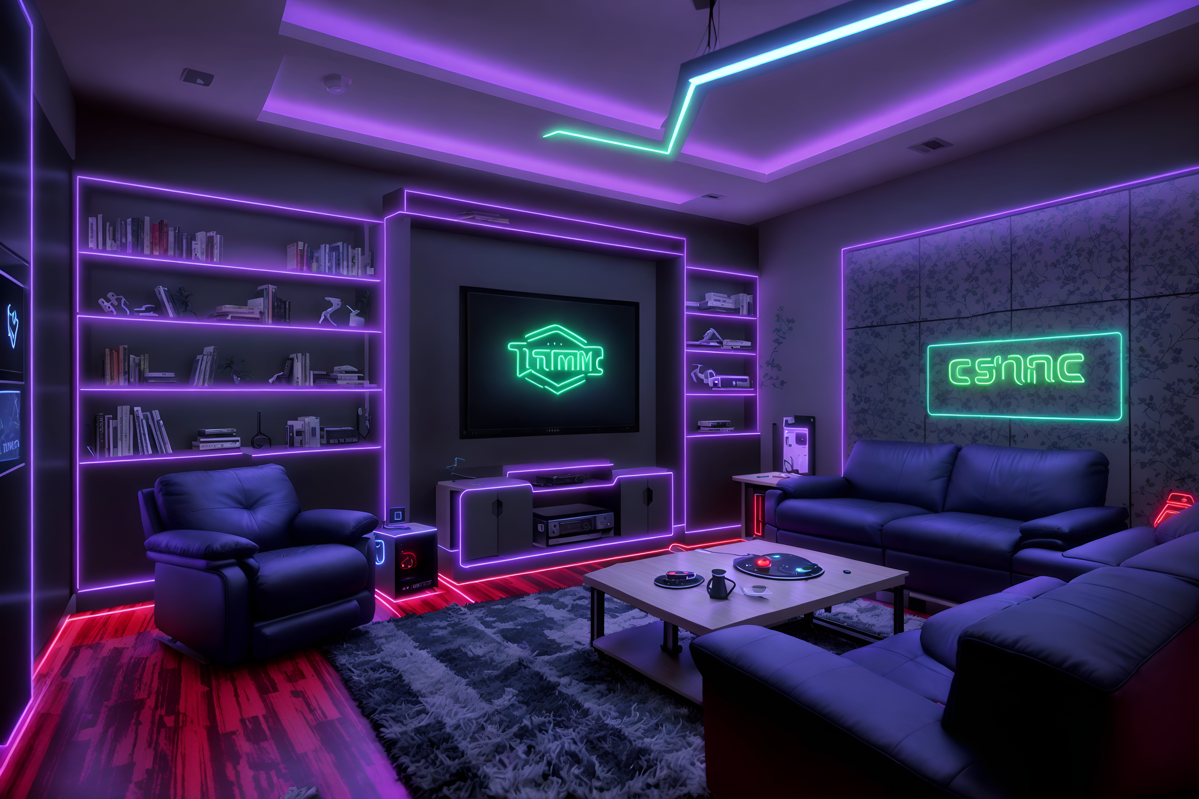 photo from pinterest of gaming room-style interior designed (kitchen living combo interior) with stove and plant and sofa and televisions and occasional tables and bookshelves and chairs and rug. . with gaming chair and speakers and computer desk with computer displays and keyboard and neon lights and neon letters on wall and multiple displays and purple, red and blue fade light and at night. . cinematic photo, highly detailed, cinematic lighting, ultra-detailed, ultrarealistic, photorealism, 8k. trending on pinterest. gaming room interior design style. masterpiece, cinematic light, ultrarealistic+, photorealistic+, 8k, raw photo, realistic, sharp focus on eyes, (symmetrical eyes), (intact eyes), hyperrealistic, highest quality, best quality, , highly detailed, masterpiece, best quality, extremely detailed 8k wallpaper, masterpiece, best quality, ultra-detailed, best shadow, detailed background, detailed face, detailed eyes, high contrast, best illumination, detailed face, dulux, caustic, dynamic angle, detailed glow. dramatic lighting. highly detailed, insanely detailed hair, symmetrical, intricate details, professionally retouched, 8k high definition. strong bokeh. award winning photo.