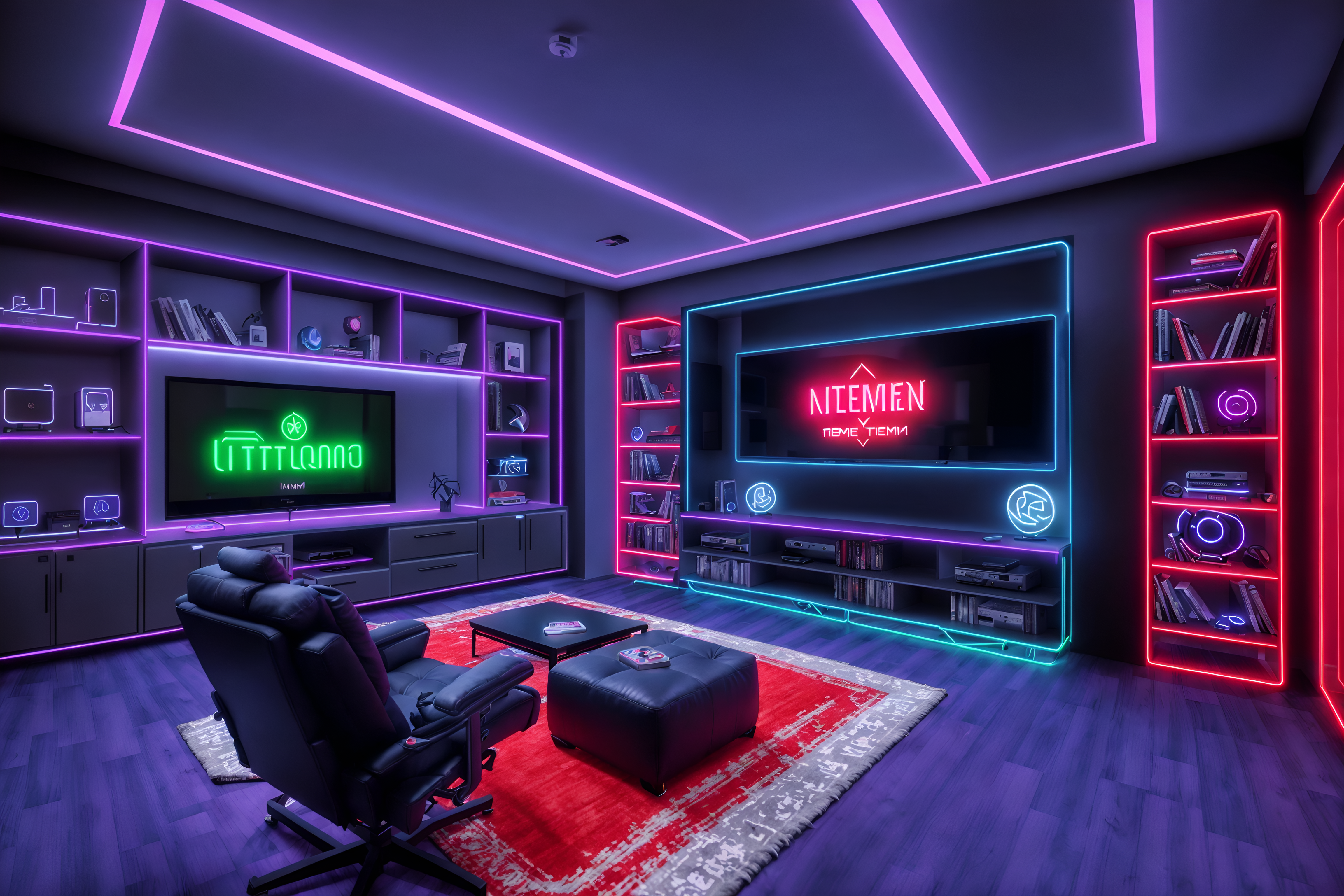 photo from pinterest of gaming room-style interior designed (kitchen living combo interior) with stove and plant and sofa and televisions and occasional tables and bookshelves and chairs and rug. . with gaming chair and speakers and computer desk with computer displays and keyboard and neon lights and neon letters on wall and multiple displays and purple, red and blue fade light and at night. . cinematic photo, highly detailed, cinematic lighting, ultra-detailed, ultrarealistic, photorealism, 8k. trending on pinterest. gaming room interior design style. masterpiece, cinematic light, ultrarealistic+, photorealistic+, 8k, raw photo, realistic, sharp focus on eyes, (symmetrical eyes), (intact eyes), hyperrealistic, highest quality, best quality, , highly detailed, masterpiece, best quality, extremely detailed 8k wallpaper, masterpiece, best quality, ultra-detailed, best shadow, detailed background, detailed face, detailed eyes, high contrast, best illumination, detailed face, dulux, caustic, dynamic angle, detailed glow. dramatic lighting. highly detailed, insanely detailed hair, symmetrical, intricate details, professionally retouched, 8k high definition. strong bokeh. award winning photo.