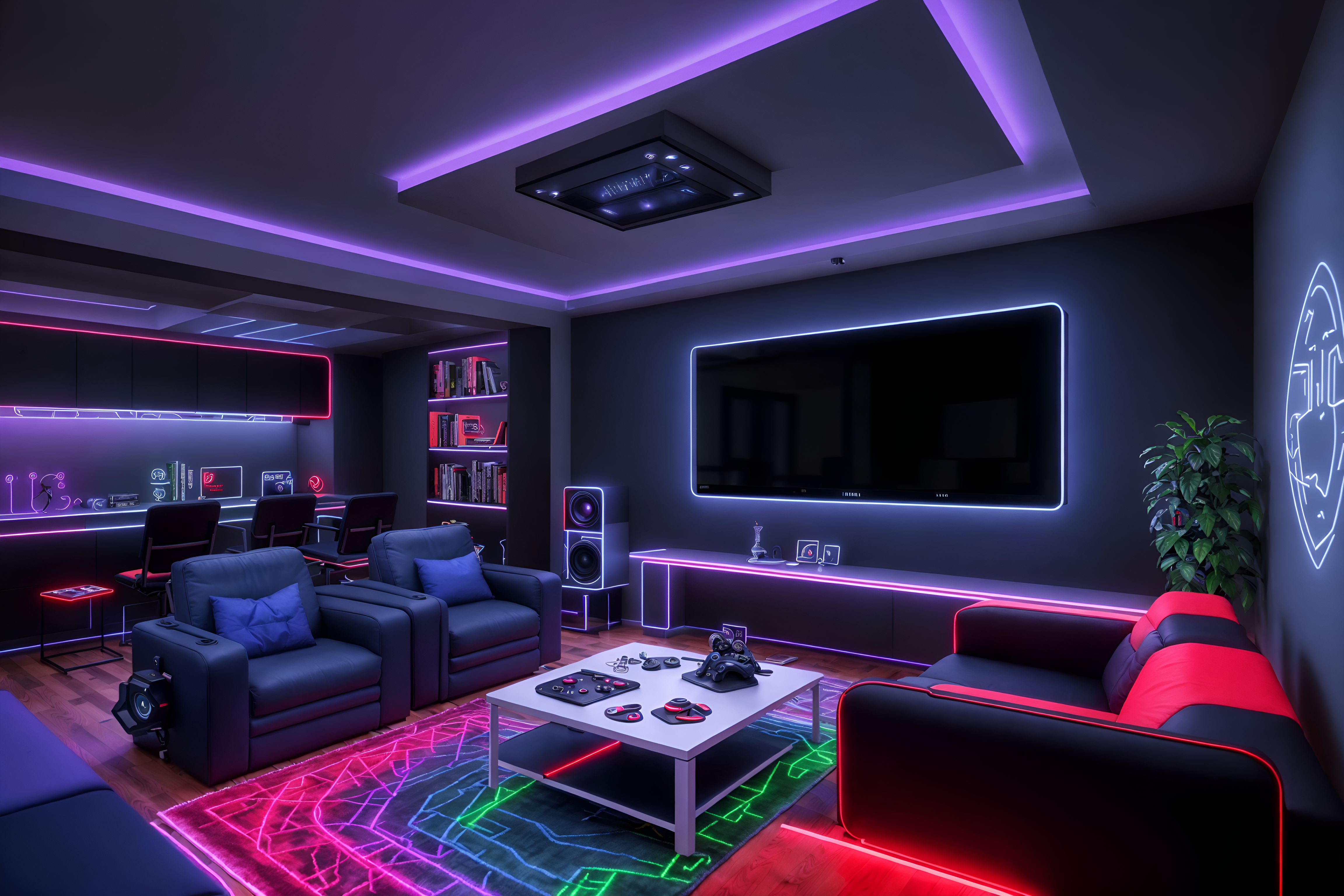photo from pinterest of gaming room-style interior designed (kitchen living combo interior) with stove and plant and sofa and televisions and occasional tables and bookshelves and chairs and rug. . with gaming chair and speakers and computer desk with computer displays and keyboard and neon lights and neon letters on wall and multiple displays and purple, red and blue fade light and at night. . cinematic photo, highly detailed, cinematic lighting, ultra-detailed, ultrarealistic, photorealism, 8k. trending on pinterest. gaming room interior design style. masterpiece, cinematic light, ultrarealistic+, photorealistic+, 8k, raw photo, realistic, sharp focus on eyes, (symmetrical eyes), (intact eyes), hyperrealistic, highest quality, best quality, , highly detailed, masterpiece, best quality, extremely detailed 8k wallpaper, masterpiece, best quality, ultra-detailed, best shadow, detailed background, detailed face, detailed eyes, high contrast, best illumination, detailed face, dulux, caustic, dynamic angle, detailed glow. dramatic lighting. highly detailed, insanely detailed hair, symmetrical, intricate details, professionally retouched, 8k high definition. strong bokeh. award winning photo.