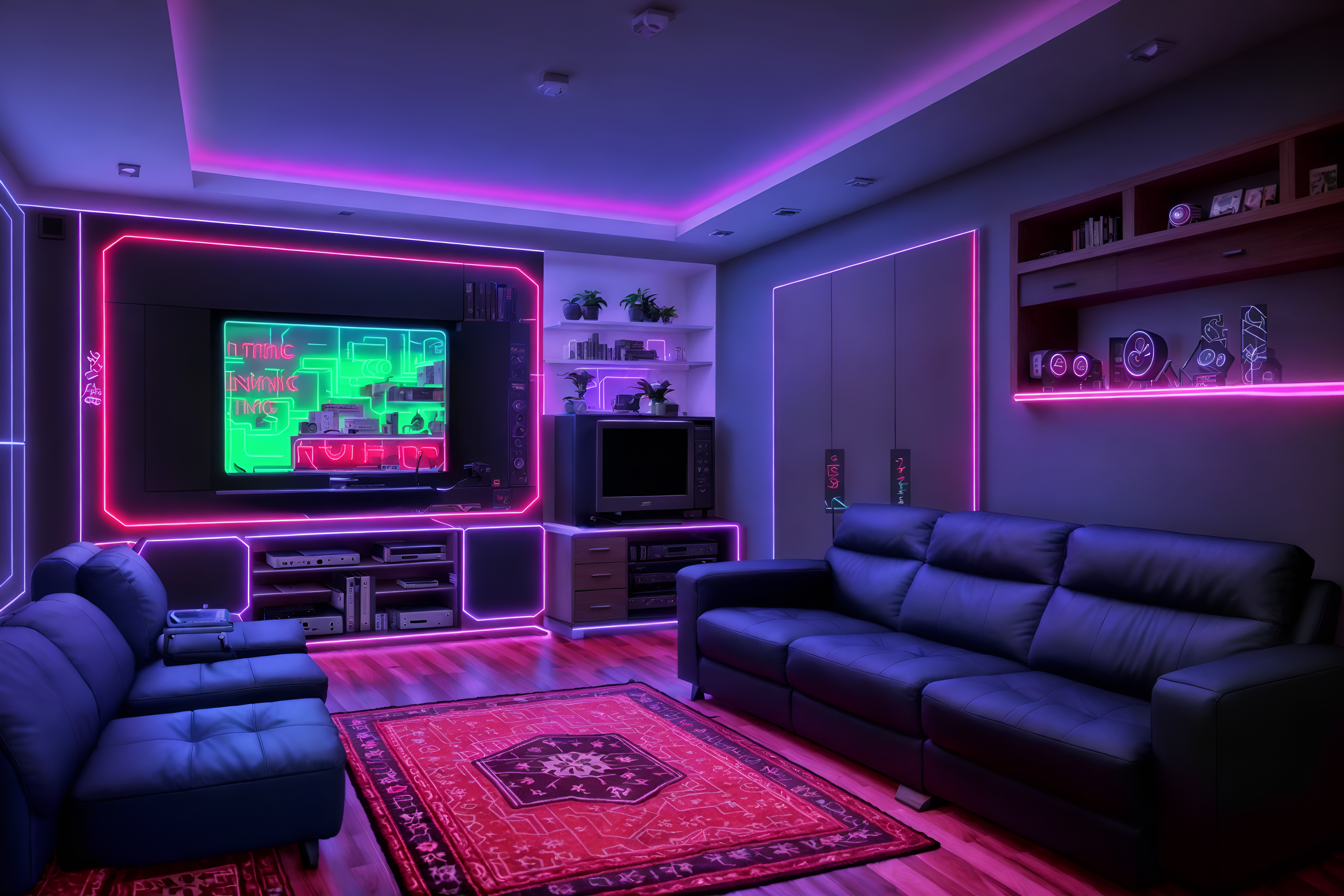 photo from pinterest of gaming room-style interior designed (kitchen living combo interior) with stove and plant and sofa and televisions and occasional tables and bookshelves and chairs and rug. . with gaming chair and speakers and computer desk with computer displays and keyboard and neon lights and neon letters on wall and multiple displays and purple, red and blue fade light and at night. . cinematic photo, highly detailed, cinematic lighting, ultra-detailed, ultrarealistic, photorealism, 8k. trending on pinterest. gaming room interior design style. masterpiece, cinematic light, ultrarealistic+, photorealistic+, 8k, raw photo, realistic, sharp focus on eyes, (symmetrical eyes), (intact eyes), hyperrealistic, highest quality, best quality, , highly detailed, masterpiece, best quality, extremely detailed 8k wallpaper, masterpiece, best quality, ultra-detailed, best shadow, detailed background, detailed face, detailed eyes, high contrast, best illumination, detailed face, dulux, caustic, dynamic angle, detailed glow. dramatic lighting. highly detailed, insanely detailed hair, symmetrical, intricate details, professionally retouched, 8k high definition. strong bokeh. award winning photo.