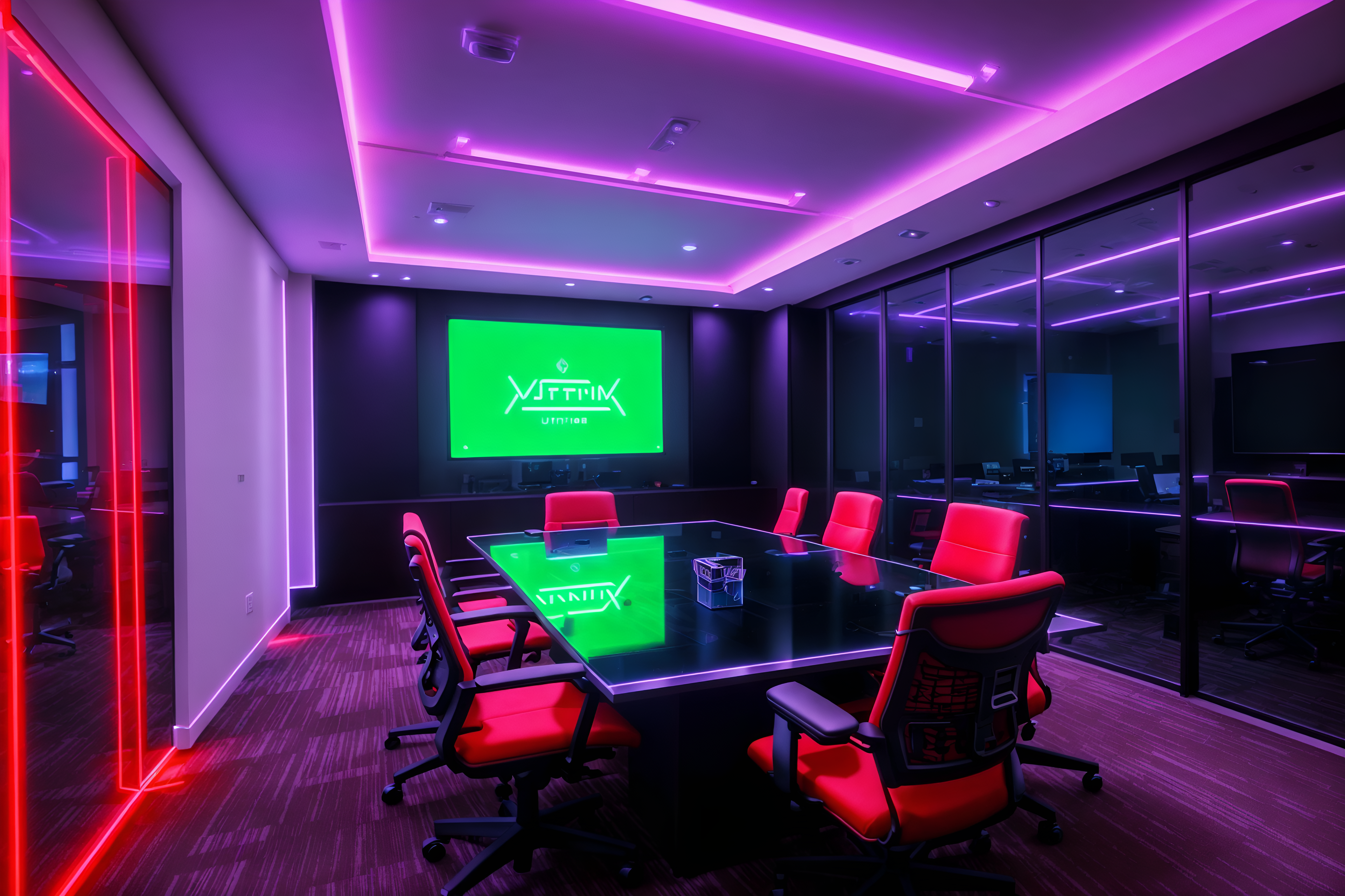 gaming room meeting roomsinterior decorate this meeting room with gaming room style. . . with boardroom table and office chairs and glass walls and painting or photo on wall and plant and vase and cabinets and glass doors. . with dark lit room and dark room and gaming chair and computer desk with computer displays and keyboard and at night and video game consoles and neon lights and neon letters on wall. . .