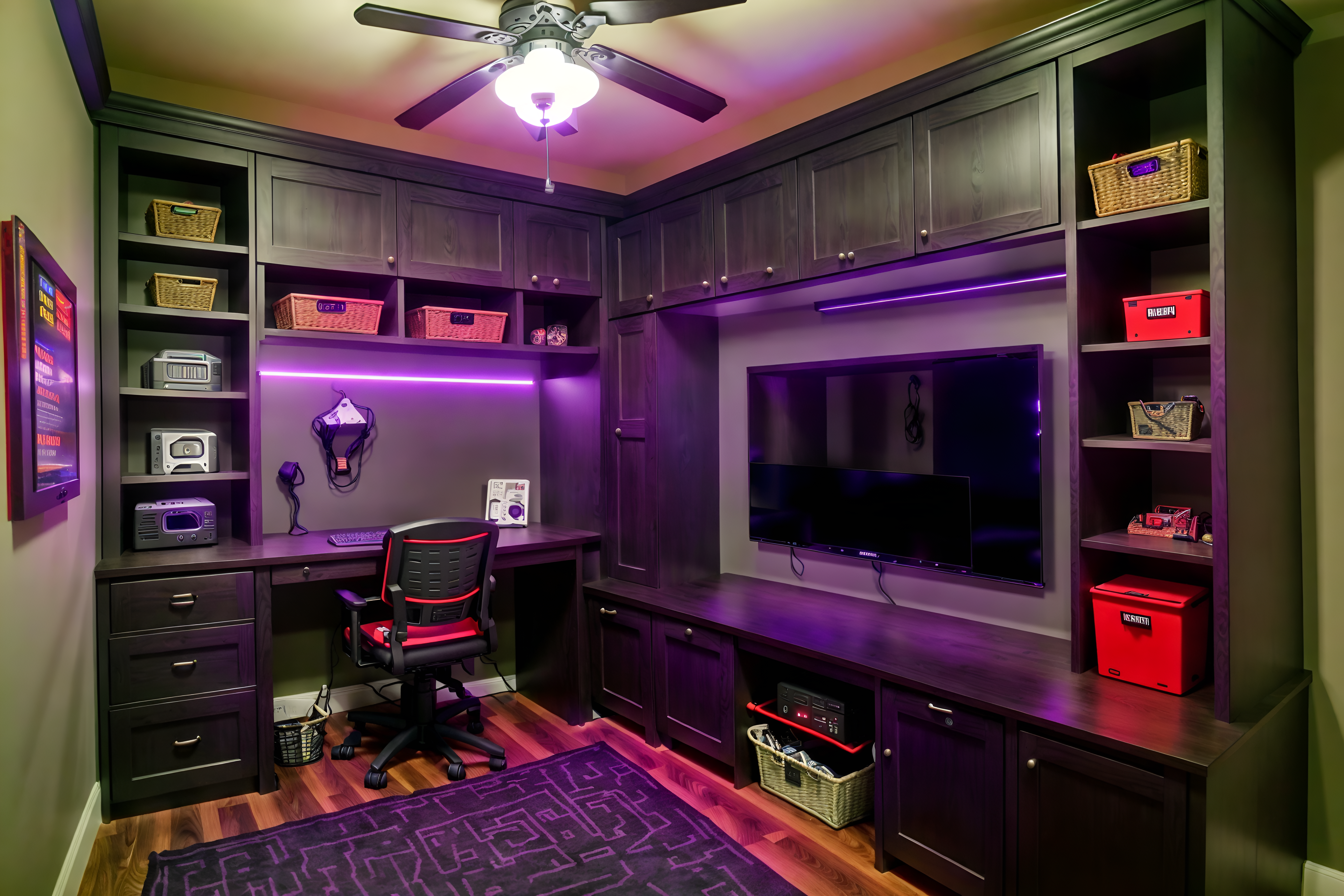 gaming room mudroomsinterior decorate this mudroom with gaming room style. . . with high up storage and shelves for shoes and wall hooks for coats and cubbies and storage baskets and cabinets and storage drawers and a bench. . with neon letters on wall and purple, red and blue fade light and dark lit room and at night and dark walls and computer desk with computer displays and keyboard and purple and red lights and speakers. . .