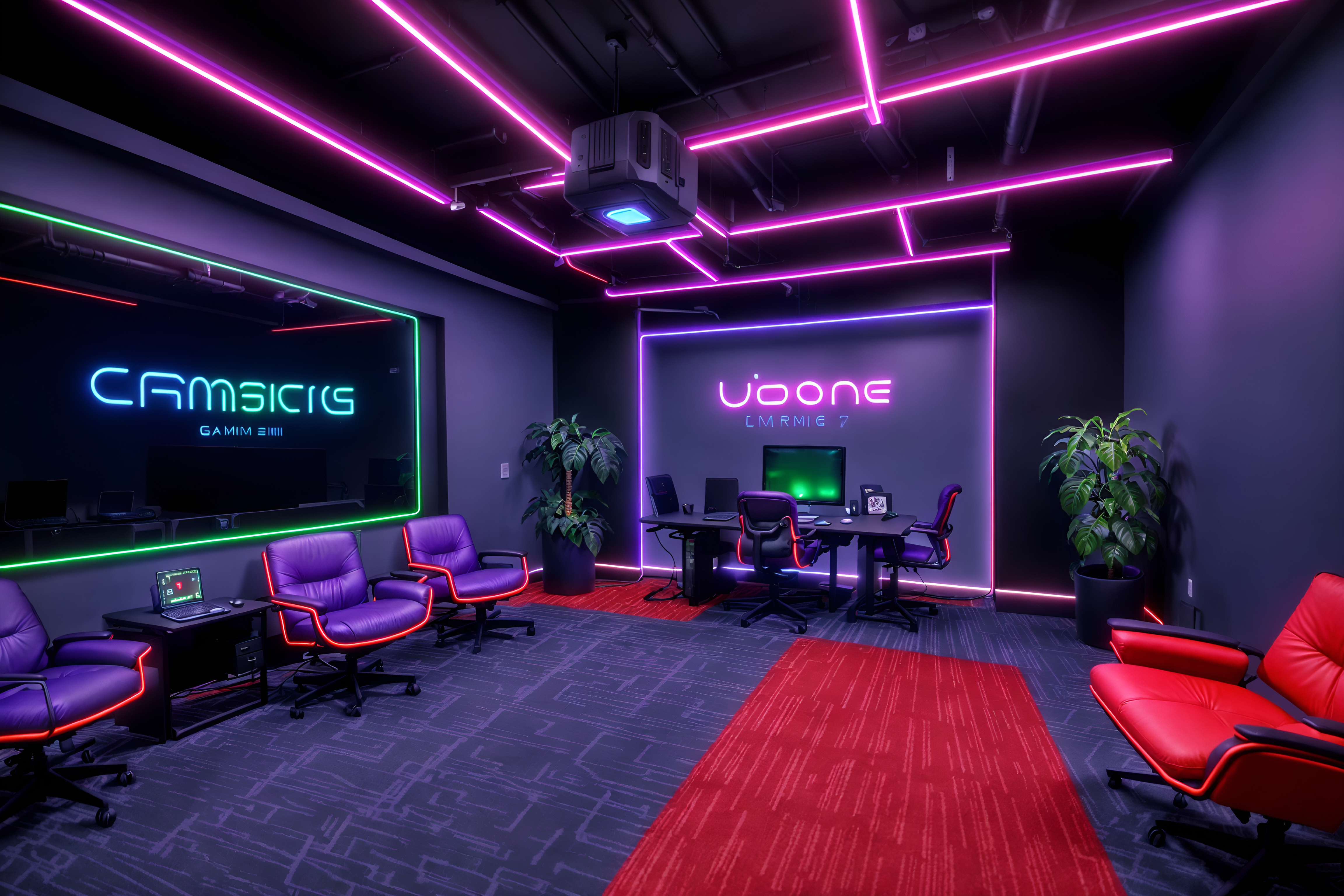 gaming room officesinterior decorate this office with gaming room style. . . with windows and plants and lounge chairs and seating area with sofa and office chairs and office desks and desk lamps and computer desks. . with dark lit room and neon lights and at night and speakers and neon letters on wall and gaming chair and dark room and video game consoles. . .