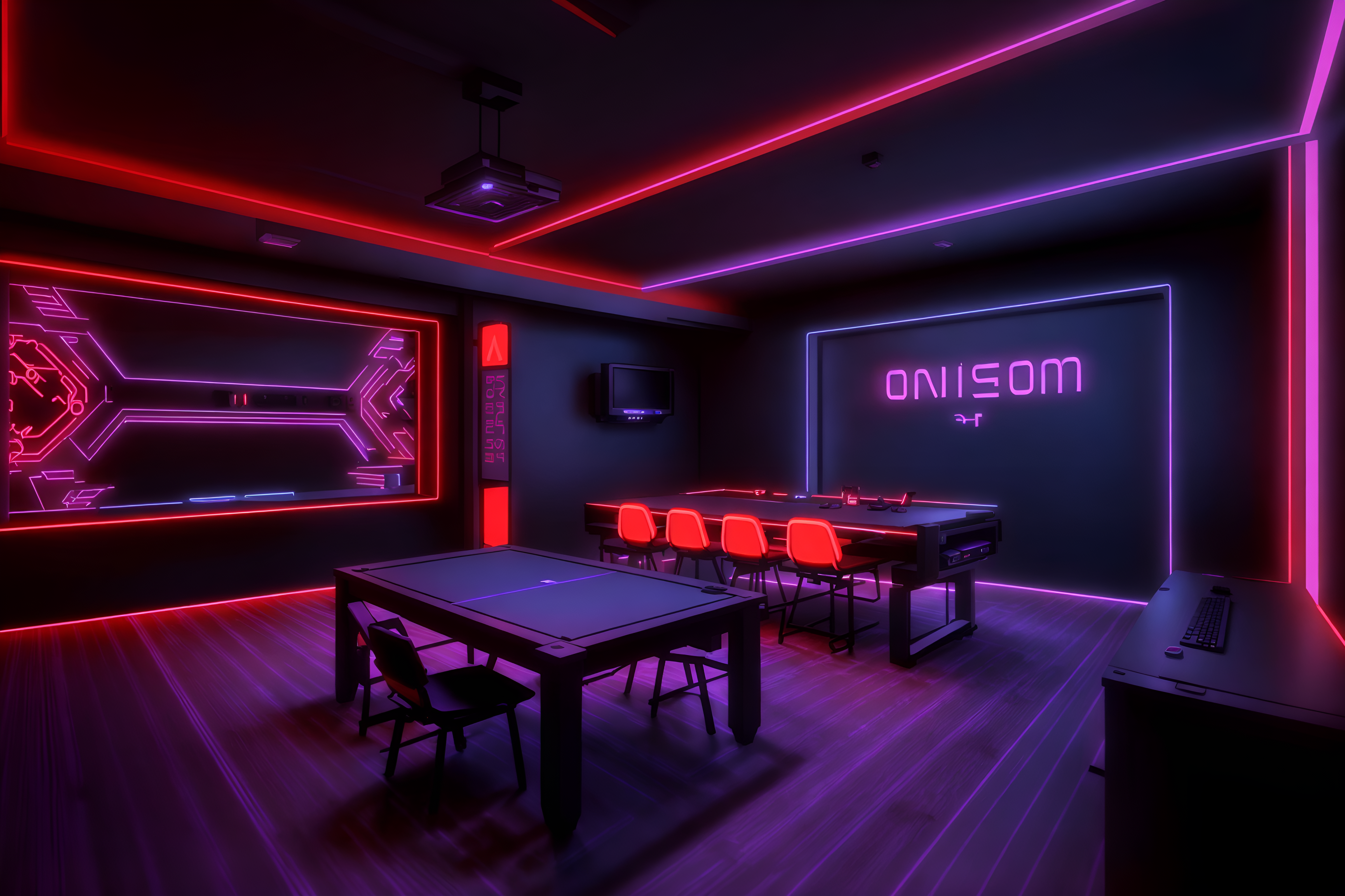 photo from pinterest of gaming room-style interior designed (onsen interior) . with purple and red lights and at night and dark room and purple, red and blue fade light and dark walls and neon letters on wall and neon lights and computer desk with computer displays and keyboard. . cinematic photo, highly detailed, cinematic lighting, ultra-detailed, ultrarealistic, photorealism, 8k. trending on pinterest. gaming room interior design style. masterpiece, cinematic light, ultrarealistic+, photorealistic+, 8k, raw photo, realistic, sharp focus on eyes, (symmetrical eyes), (intact eyes), hyperrealistic, highest quality, best quality, , highly detailed, masterpiece, best quality, extremely detailed 8k wallpaper, masterpiece, best quality, ultra-detailed, best shadow, detailed background, detailed face, detailed eyes, high contrast, best illumination, detailed face, dulux, caustic, dynamic angle, detailed glow. dramatic lighting. highly detailed, insanely detailed hair, symmetrical, intricate details, professionally retouched, 8k high definition. strong bokeh. award winning photo.