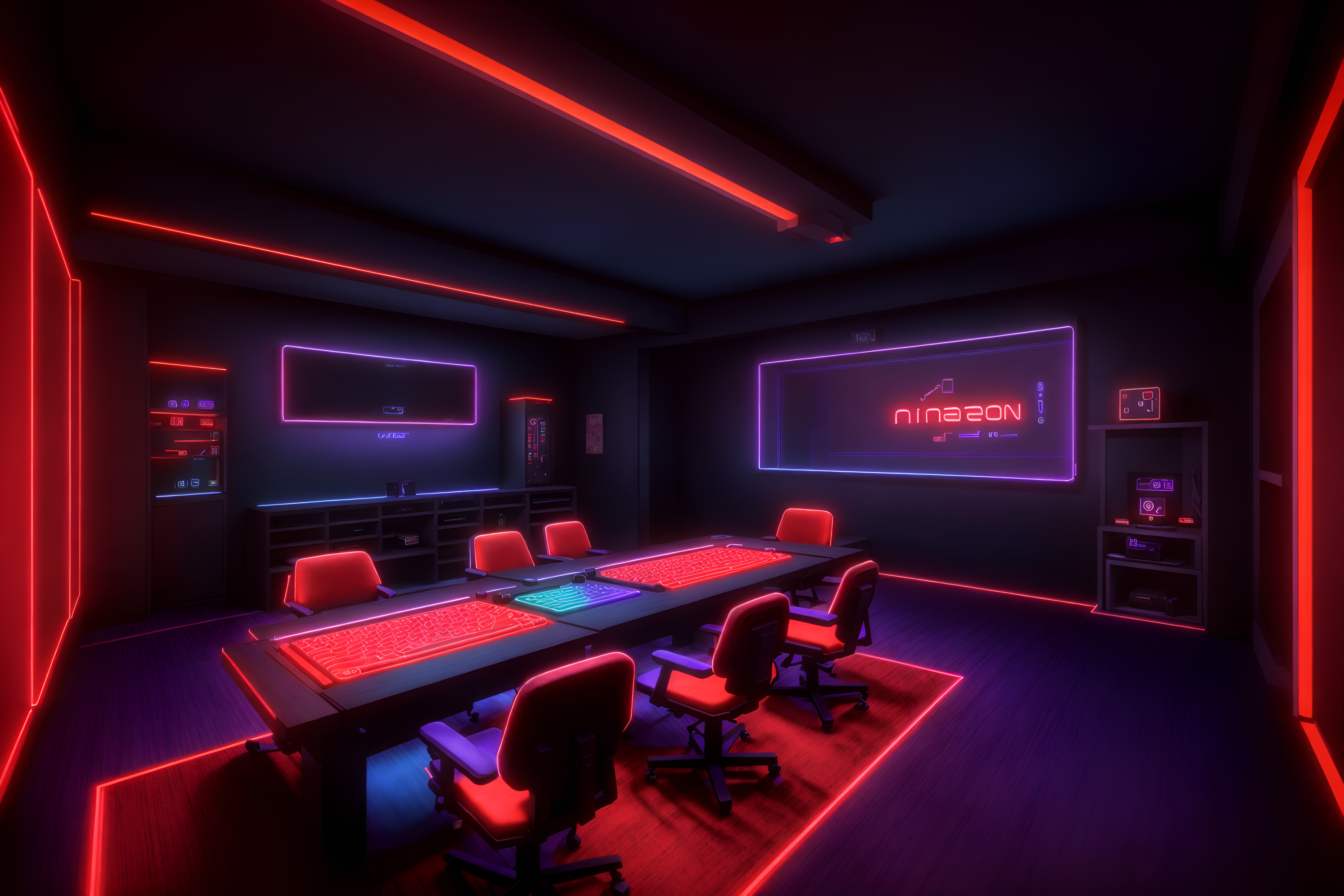 gaming room interiorsinterior decorate this kids room with gaming room style. . . with bed and plant and headboard and bedside table or night stand and mirror and storage bench or ottoman and night light and accent chair. . with dark lit room and neon letters on wall and speakers and neon lights and purple and red lights and dark room and video game consoles and multiple displays. . .interior decorate this podcast studio with gaming room style. . . with radio station studio and talk show studio and radio station studio and headphones on table and talk show interior and talk show studio and talk show studio and sturdy desk. . with speakers and computer desk with computer displays and keyboard and multiple displays and video game consoles and dark room and dark lit room and gaming chair and neon letters on wall. . .interior decorate this clothing store with gaming room style. . . . with video game consoles and dark lit room and neon letters on wall and purple, red and blue fade light and at night and dark room and dark walls and multiple displays. . .interior decorate this workshop with gaming room style. . . with tool wall and messy and wooden workbench and tool wall. . with dark walls and purple, red and blue fade light and computer desk with computer displays and keyboard and dark room and neon letters on wall and at night and gaming chair and speakers. . .interior decorate this movie set with gaming room style. . . with professional lighting equipment and professional movie set and softbox lights and cinematic lighting and film set interior and equipment table and movie backdrop and camera on tripod. . with purple and red lights and video game consoles and at night and purple, red and blue fade light and dark room and neon lights and multiple displays and neon letters on wall. . .interior decorate this conference hall with gaming room style. . . with speaker phone and microphones and projector and water glasses and flipchart and notepads and office chairs and whiteboard. . with speakers and multiple displays and purple, red and blue fade light and gaming chair and neon lights and dark walls and computer desk with computer displays and keyboard and purple and red lights. . .interior decorate this photography studio with gaming room style. . . with professional photography studio and professional photography studio and soft lighting and photography studio and photography umbrella lights and softbox lights and professional lighting equipment and ring light. . with dark walls and neon lights and multiple displays and purple, red and blue fade light and purple and red lights and at night and dark lit room and gaming chair. . .interior decorate this classroom with gaming room style. . . with erasers and educational posters and chairs and globe and pencils and desks and books and teacher desk. . with neon lights and neon letters on wall and multiple displays and at night and video game consoles and dark room and purple, red and blue fade light and purple and red lights. . .interior decorate this drop zone with gaming room style. . . with a bench and cabinets and storage drawers and shelves for shoes and wall hooks for coats and cubbies and high up storage and storage baskets. . with speakers and dark room and video game consoles and dark lit room and at night and neon letters on wall and dark walls and multiple displays. . .