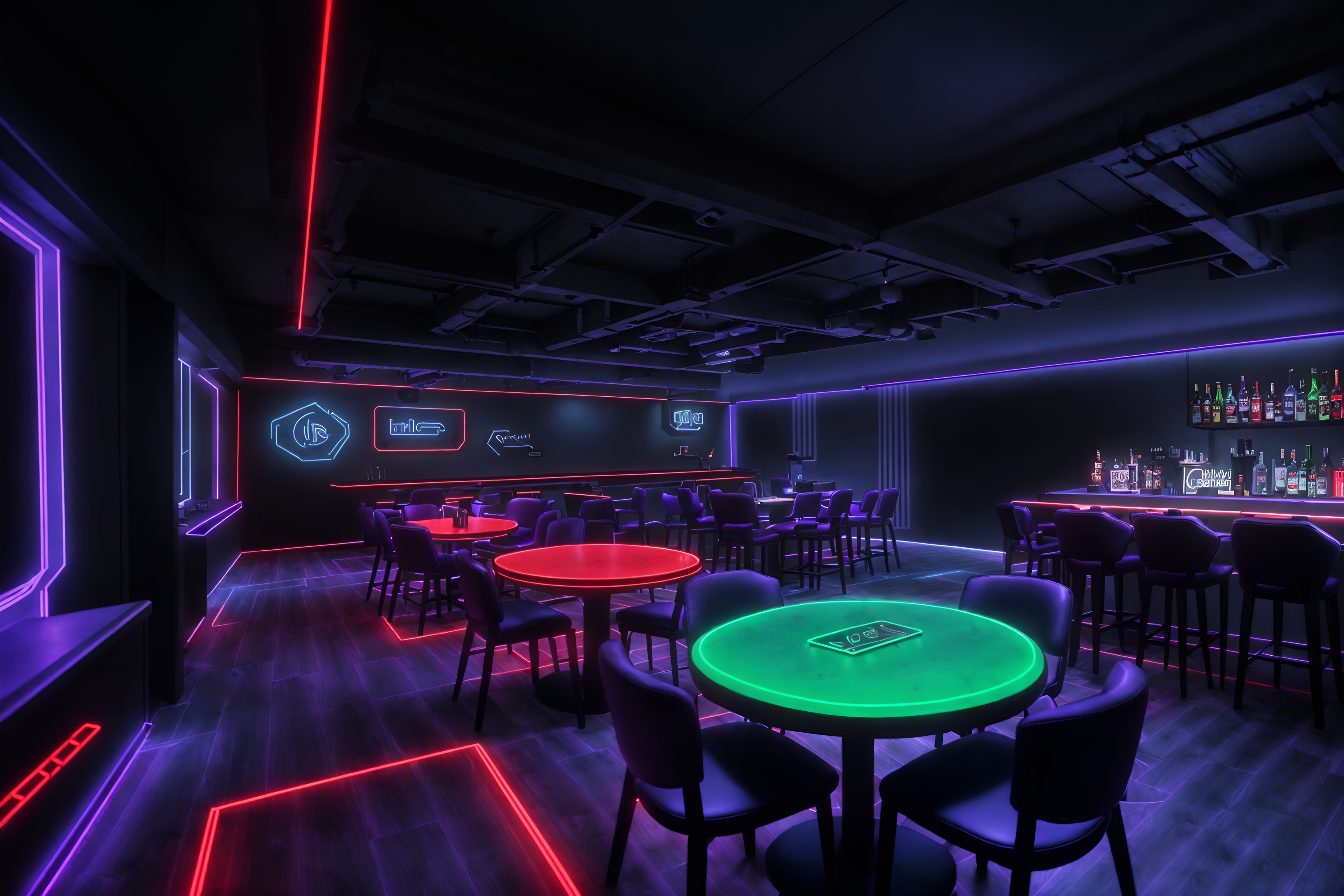 photo from pinterest of gaming room-style interior designed (restaurant interior) with restaurant bar and restaurant chairs and restaurant dining tables and restaurant decor and restaurant bar. . with dark room and neon lights and purple, red and blue fade light and at night and dark walls and speakers and gaming chair and computer desk with computer displays and keyboard. . cinematic photo, highly detailed, cinematic lighting, ultra-detailed, ultrarealistic, photorealism, 8k. trending on pinterest. gaming room interior design style. masterpiece, cinematic light, ultrarealistic+, photorealistic+, 8k, raw photo, realistic, sharp focus on eyes, (symmetrical eyes), (intact eyes), hyperrealistic, highest quality, best quality, , highly detailed, masterpiece, best quality, extremely detailed 8k wallpaper, masterpiece, best quality, ultra-detailed, best shadow, detailed background, detailed face, detailed eyes, high contrast, best illumination, detailed face, dulux, caustic, dynamic angle, detailed glow. dramatic lighting. highly detailed, insanely detailed hair, symmetrical, intricate details, professionally retouched, 8k high definition. strong bokeh. award winning photo.