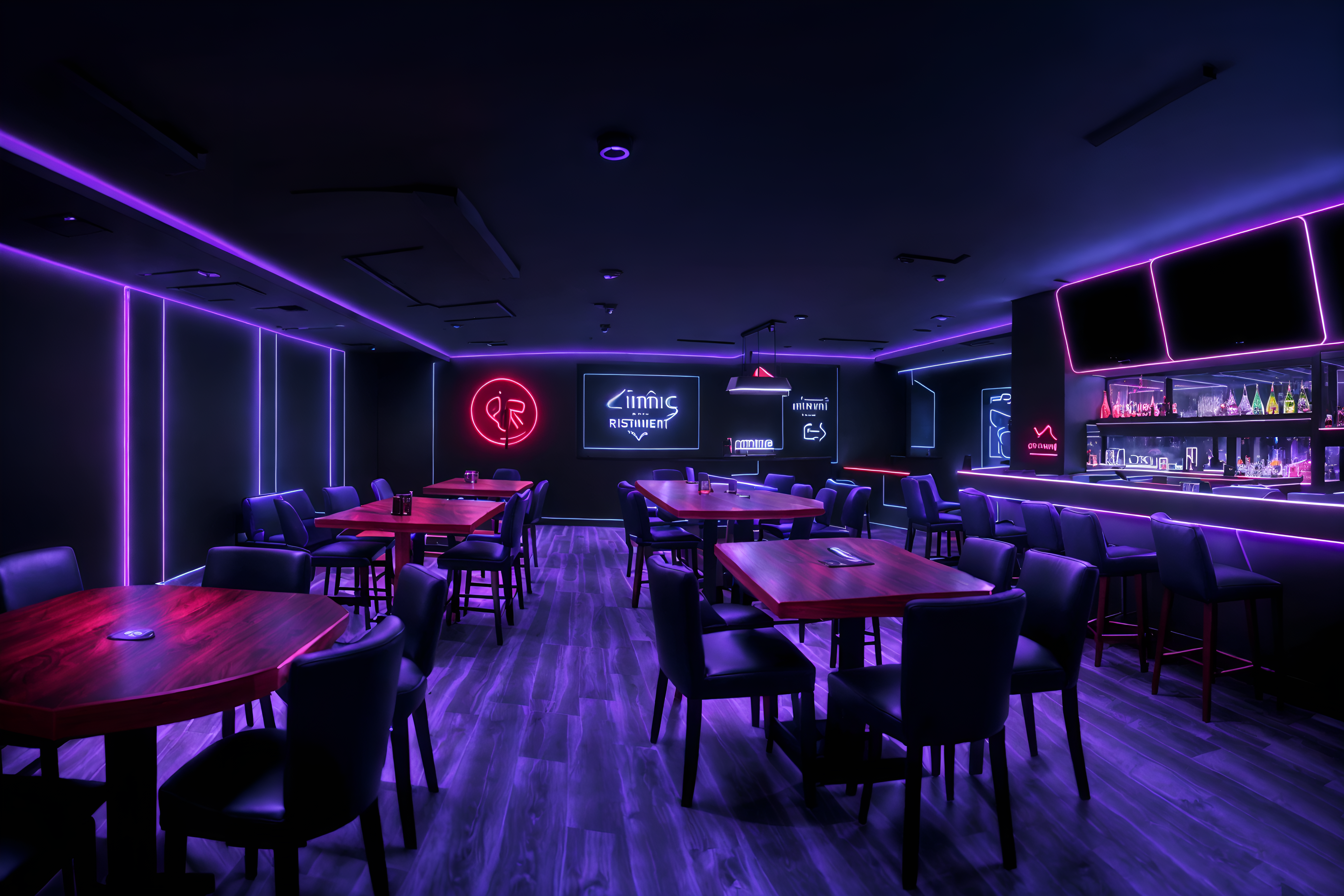 photo from pinterest of gaming room-style interior designed (restaurant interior) with restaurant bar and restaurant chairs and restaurant dining tables and restaurant decor and restaurant bar. . with dark room and neon lights and purple, red and blue fade light and at night and dark walls and speakers and gaming chair and computer desk with computer displays and keyboard. . cinematic photo, highly detailed, cinematic lighting, ultra-detailed, ultrarealistic, photorealism, 8k. trending on pinterest. gaming room interior design style. masterpiece, cinematic light, ultrarealistic+, photorealistic+, 8k, raw photo, realistic, sharp focus on eyes, (symmetrical eyes), (intact eyes), hyperrealistic, highest quality, best quality, , highly detailed, masterpiece, best quality, extremely detailed 8k wallpaper, masterpiece, best quality, ultra-detailed, best shadow, detailed background, detailed face, detailed eyes, high contrast, best illumination, detailed face, dulux, caustic, dynamic angle, detailed glow. dramatic lighting. highly detailed, insanely detailed hair, symmetrical, intricate details, professionally retouched, 8k high definition. strong bokeh. award winning photo.