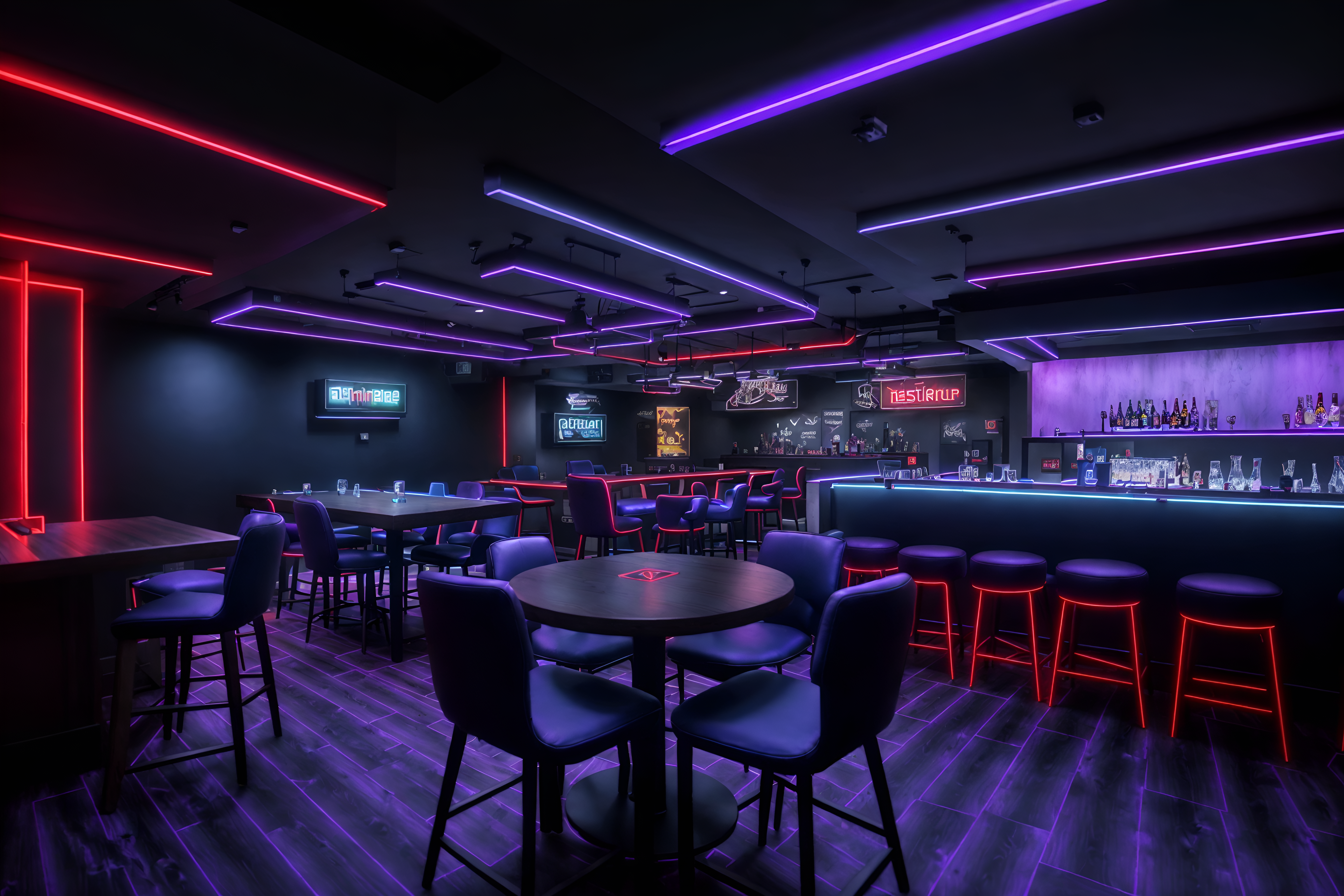 photo from pinterest of gaming room-style interior designed (restaurant interior) with restaurant bar and restaurant chairs and restaurant dining tables and restaurant decor and restaurant bar. . with dark room and neon lights and purple, red and blue fade light and at night and dark walls and speakers and gaming chair and computer desk with computer displays and keyboard. . cinematic photo, highly detailed, cinematic lighting, ultra-detailed, ultrarealistic, photorealism, 8k. trending on pinterest. gaming room interior design style. masterpiece, cinematic light, ultrarealistic+, photorealistic+, 8k, raw photo, realistic, sharp focus on eyes, (symmetrical eyes), (intact eyes), hyperrealistic, highest quality, best quality, , highly detailed, masterpiece, best quality, extremely detailed 8k wallpaper, masterpiece, best quality, ultra-detailed, best shadow, detailed background, detailed face, detailed eyes, high contrast, best illumination, detailed face, dulux, caustic, dynamic angle, detailed glow. dramatic lighting. highly detailed, insanely detailed hair, symmetrical, intricate details, professionally retouched, 8k high definition. strong bokeh. award winning photo.