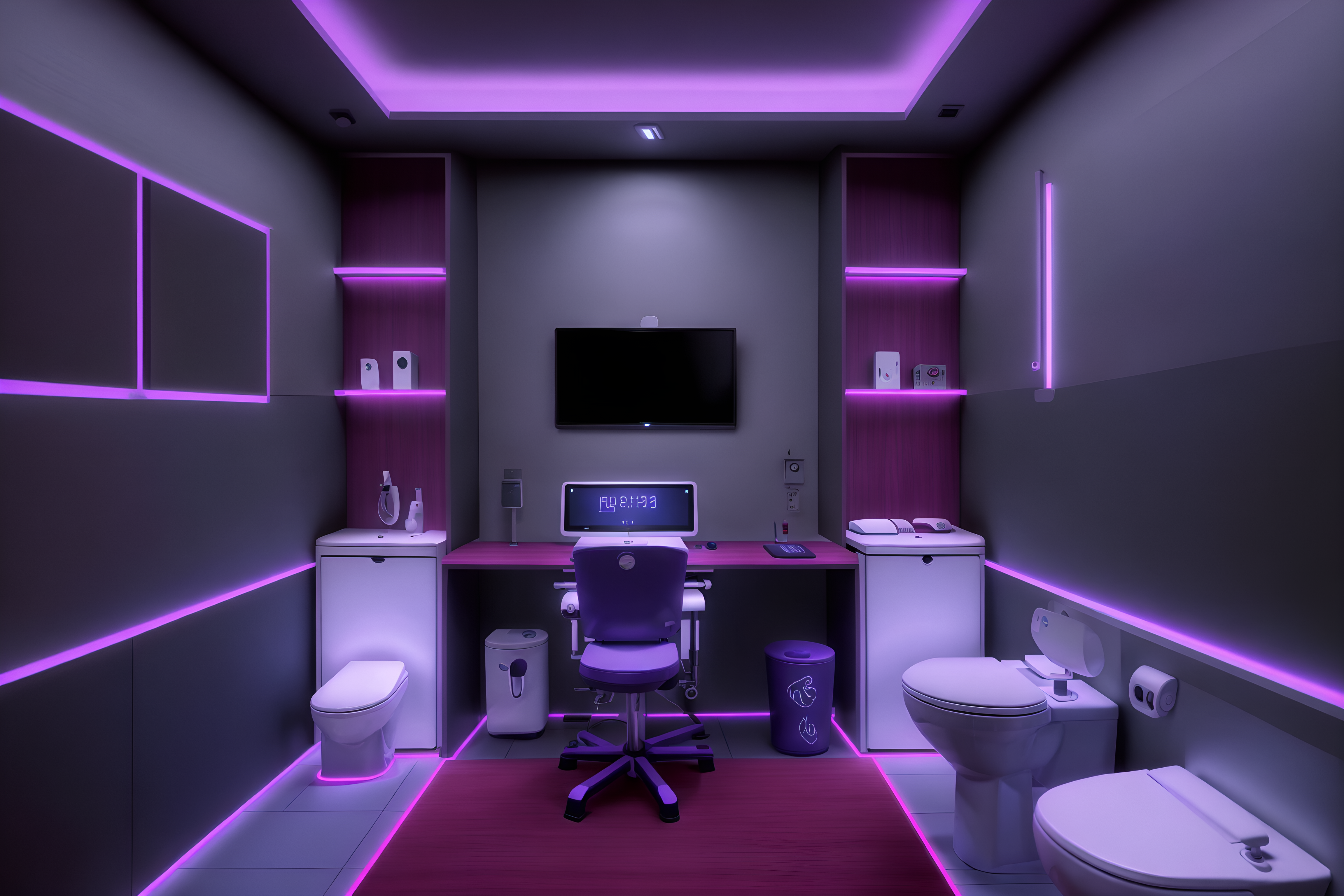 photo from pinterest of gaming room-style interior designed (toilet interior) with toilet with toilet seat up and toilet paper hanger and sink with tap and toilet with toilet seat up. . with purple, red and blue fade light and computer desk with computer displays and keyboard and purple and red lights and multiple displays and at night and dark walls and neon lights and dark room. . cinematic photo, highly detailed, cinematic lighting, ultra-detailed, ultrarealistic, photorealism, 8k. trending on pinterest. gaming room interior design style. masterpiece, cinematic light, ultrarealistic+, photorealistic+, 8k, raw photo, realistic, sharp focus on eyes, (symmetrical eyes), (intact eyes), hyperrealistic, highest quality, best quality, , highly detailed, masterpiece, best quality, extremely detailed 8k wallpaper, masterpiece, best quality, ultra-detailed, best shadow, detailed background, detailed face, detailed eyes, high contrast, best illumination, detailed face, dulux, caustic, dynamic angle, detailed glow. dramatic lighting. highly detailed, insanely detailed hair, symmetrical, intricate details, professionally retouched, 8k high definition. strong bokeh. award winning photo.