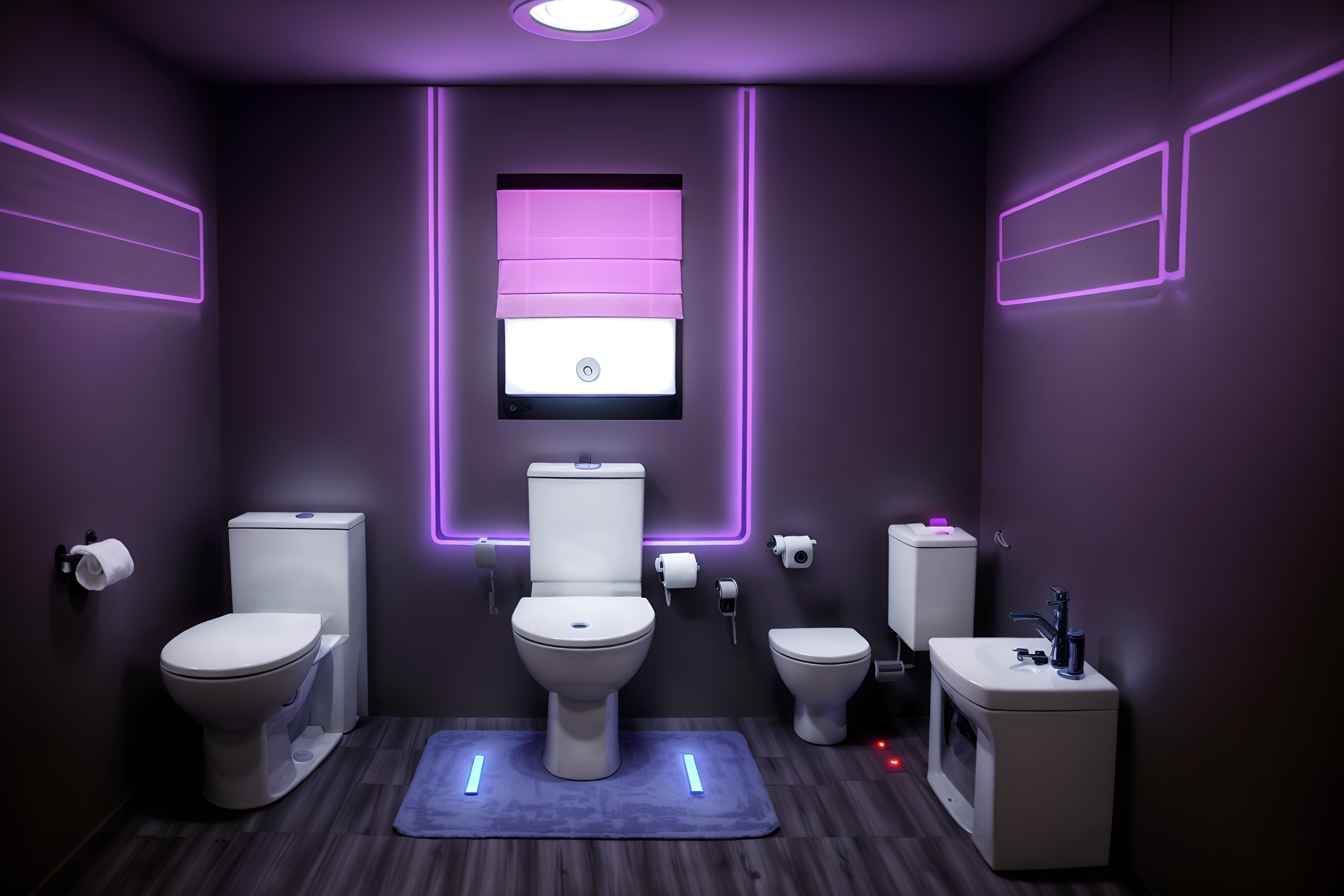 photo from pinterest of gaming room-style interior designed (toilet interior) with toilet with toilet seat up and toilet paper hanger and sink with tap and toilet with toilet seat up. . with purple, red and blue fade light and computer desk with computer displays and keyboard and purple and red lights and multiple displays and at night and dark walls and neon lights and dark room. . cinematic photo, highly detailed, cinematic lighting, ultra-detailed, ultrarealistic, photorealism, 8k. trending on pinterest. gaming room interior design style. masterpiece, cinematic light, ultrarealistic+, photorealistic+, 8k, raw photo, realistic, sharp focus on eyes, (symmetrical eyes), (intact eyes), hyperrealistic, highest quality, best quality, , highly detailed, masterpiece, best quality, extremely detailed 8k wallpaper, masterpiece, best quality, ultra-detailed, best shadow, detailed background, detailed face, detailed eyes, high contrast, best illumination, detailed face, dulux, caustic, dynamic angle, detailed glow. dramatic lighting. highly detailed, insanely detailed hair, symmetrical, intricate details, professionally retouched, 8k high definition. strong bokeh. award winning photo.