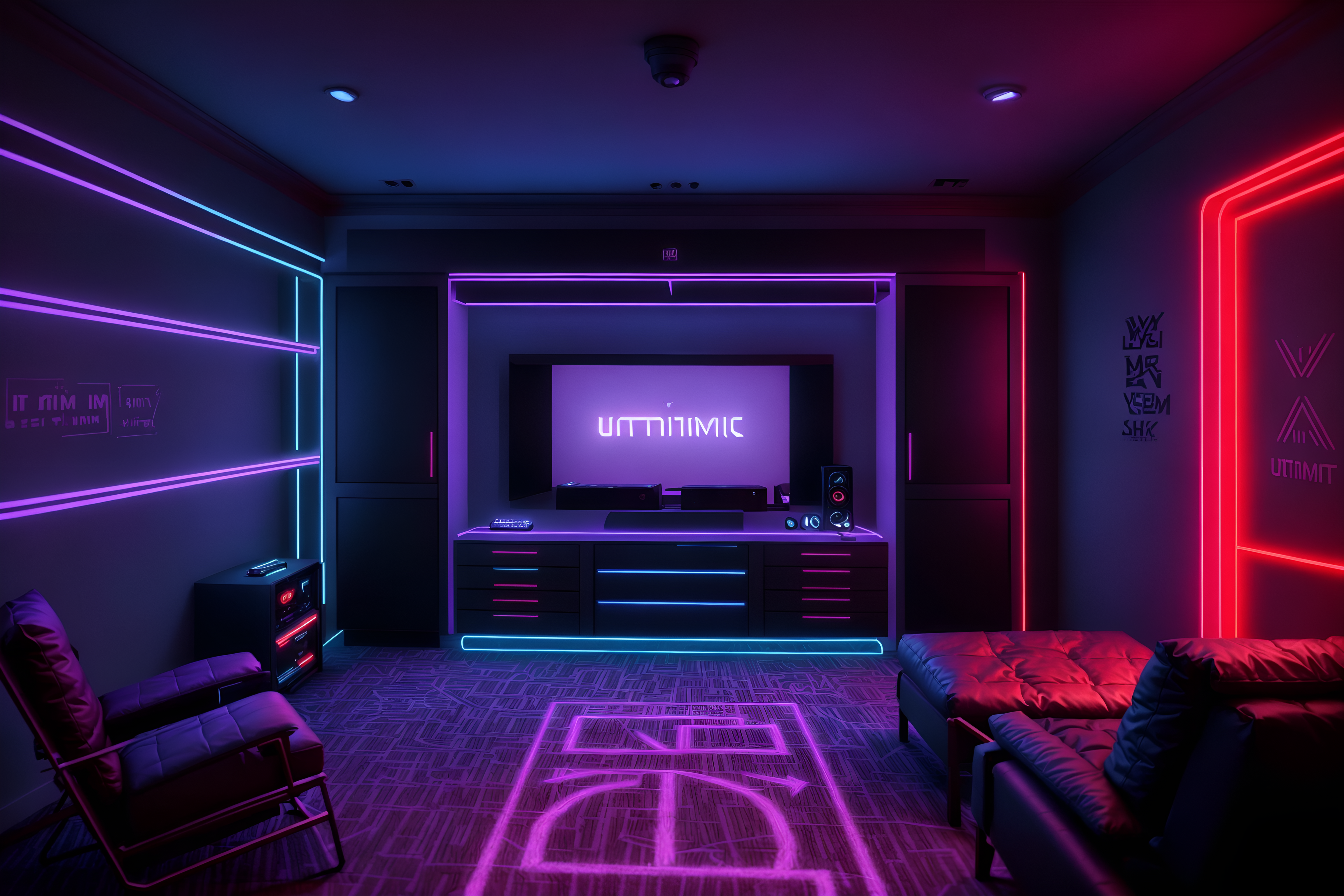 photo from pinterest of gaming room-style interior designed (walk in closet interior) . with neon letters on wall and at night and purple and red lights and speakers and purple, red and blue fade light and multiple displays and dark walls and dark room. . cinematic photo, highly detailed, cinematic lighting, ultra-detailed, ultrarealistic, photorealism, 8k. trending on pinterest. gaming room interior design style. masterpiece, cinematic light, ultrarealistic+, photorealistic+, 8k, raw photo, realistic, sharp focus on eyes, (symmetrical eyes), (intact eyes), hyperrealistic, highest quality, best quality, , highly detailed, masterpiece, best quality, extremely detailed 8k wallpaper, masterpiece, best quality, ultra-detailed, best shadow, detailed background, detailed face, detailed eyes, high contrast, best illumination, detailed face, dulux, caustic, dynamic angle, detailed glow. dramatic lighting. highly detailed, insanely detailed hair, symmetrical, intricate details, professionally retouched, 8k high definition. strong bokeh. award winning photo.
