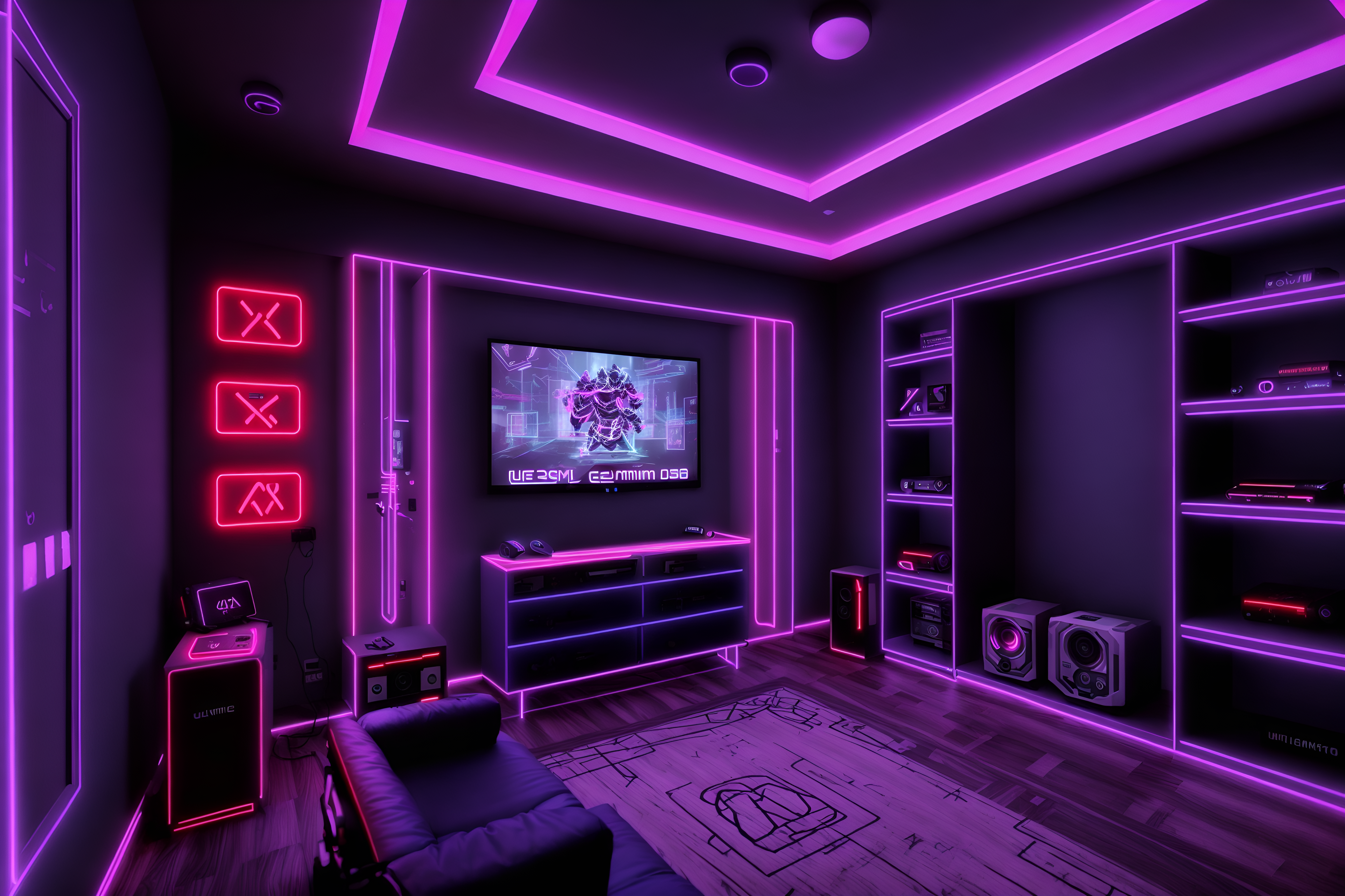 photo from pinterest of gaming room-style interior designed (walk in closet interior) . with neon letters on wall and at night and purple and red lights and speakers and purple, red and blue fade light and multiple displays and dark walls and dark room. . cinematic photo, highly detailed, cinematic lighting, ultra-detailed, ultrarealistic, photorealism, 8k. trending on pinterest. gaming room interior design style. masterpiece, cinematic light, ultrarealistic+, photorealistic+, 8k, raw photo, realistic, sharp focus on eyes, (symmetrical eyes), (intact eyes), hyperrealistic, highest quality, best quality, , highly detailed, masterpiece, best quality, extremely detailed 8k wallpaper, masterpiece, best quality, ultra-detailed, best shadow, detailed background, detailed face, detailed eyes, high contrast, best illumination, detailed face, dulux, caustic, dynamic angle, detailed glow. dramatic lighting. highly detailed, insanely detailed hair, symmetrical, intricate details, professionally retouched, 8k high definition. strong bokeh. award winning photo.