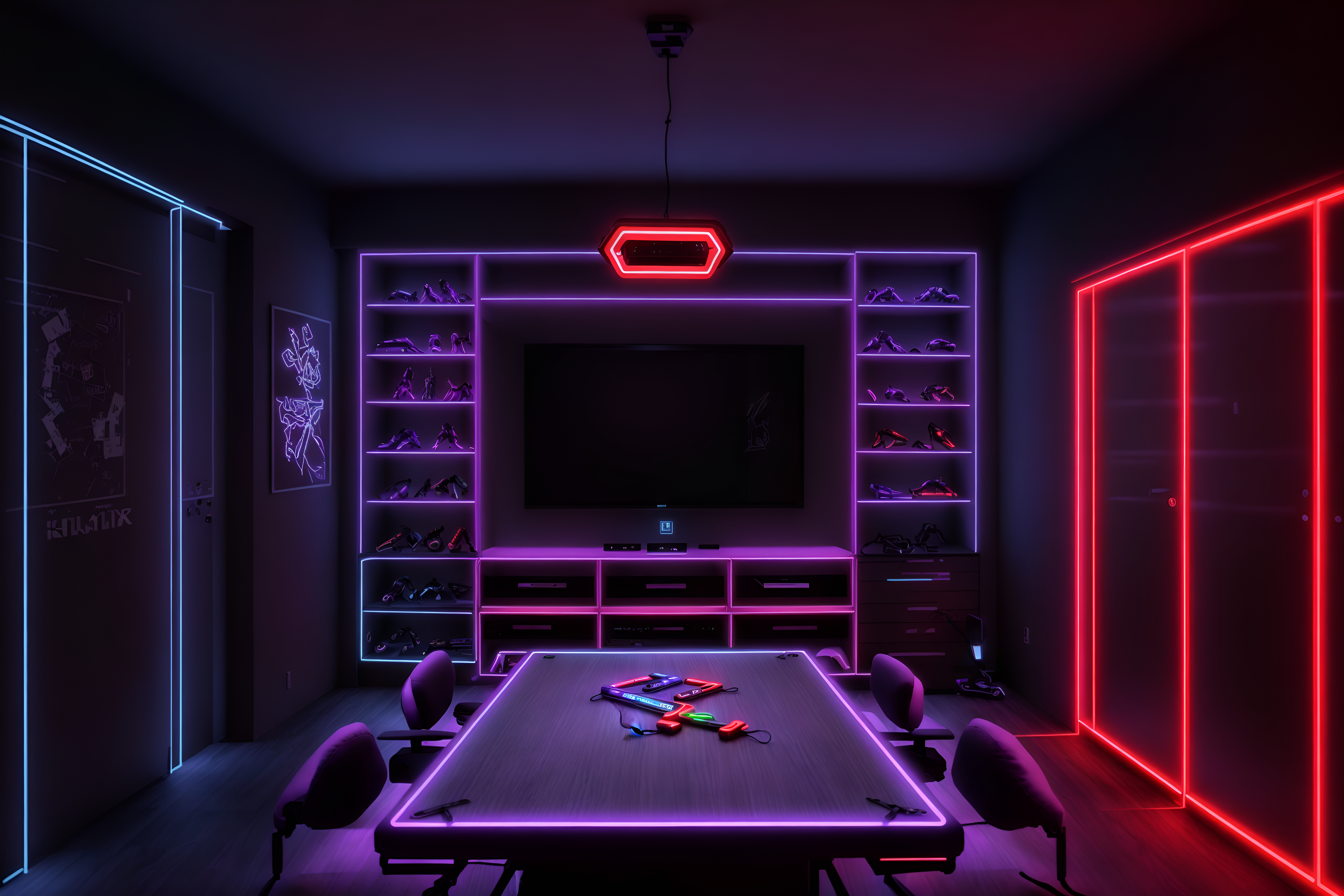 photo from pinterest of gaming room-style interior designed (walk in closet interior) . with neon letters on wall and at night and purple and red lights and speakers and purple, red and blue fade light and multiple displays and dark walls and dark room. . cinematic photo, highly detailed, cinematic lighting, ultra-detailed, ultrarealistic, photorealism, 8k. trending on pinterest. gaming room interior design style. masterpiece, cinematic light, ultrarealistic+, photorealistic+, 8k, raw photo, realistic, sharp focus on eyes, (symmetrical eyes), (intact eyes), hyperrealistic, highest quality, best quality, , highly detailed, masterpiece, best quality, extremely detailed 8k wallpaper, masterpiece, best quality, ultra-detailed, best shadow, detailed background, detailed face, detailed eyes, high contrast, best illumination, detailed face, dulux, caustic, dynamic angle, detailed glow. dramatic lighting. highly detailed, insanely detailed hair, symmetrical, intricate details, professionally retouched, 8k high definition. strong bokeh. award winning photo.