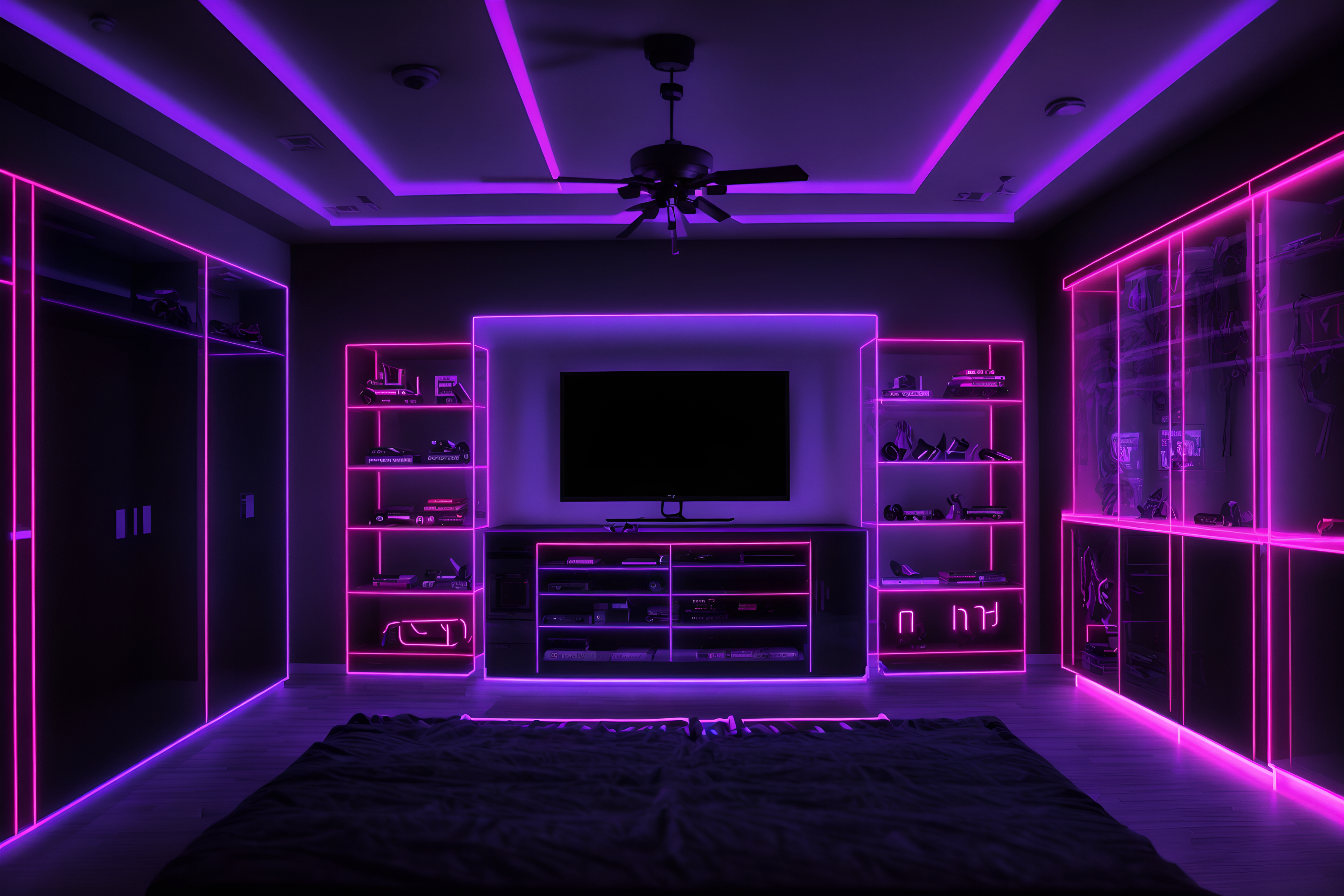 photo from pinterest of gaming room-style interior designed (walk in closet interior) . with neon letters on wall and at night and purple and red lights and speakers and purple, red and blue fade light and multiple displays and dark walls and dark room. . cinematic photo, highly detailed, cinematic lighting, ultra-detailed, ultrarealistic, photorealism, 8k. trending on pinterest. gaming room interior design style. masterpiece, cinematic light, ultrarealistic+, photorealistic+, 8k, raw photo, realistic, sharp focus on eyes, (symmetrical eyes), (intact eyes), hyperrealistic, highest quality, best quality, , highly detailed, masterpiece, best quality, extremely detailed 8k wallpaper, masterpiece, best quality, ultra-detailed, best shadow, detailed background, detailed face, detailed eyes, high contrast, best illumination, detailed face, dulux, caustic, dynamic angle, detailed glow. dramatic lighting. highly detailed, insanely detailed hair, symmetrical, intricate details, professionally retouched, 8k high definition. strong bokeh. award winning photo.