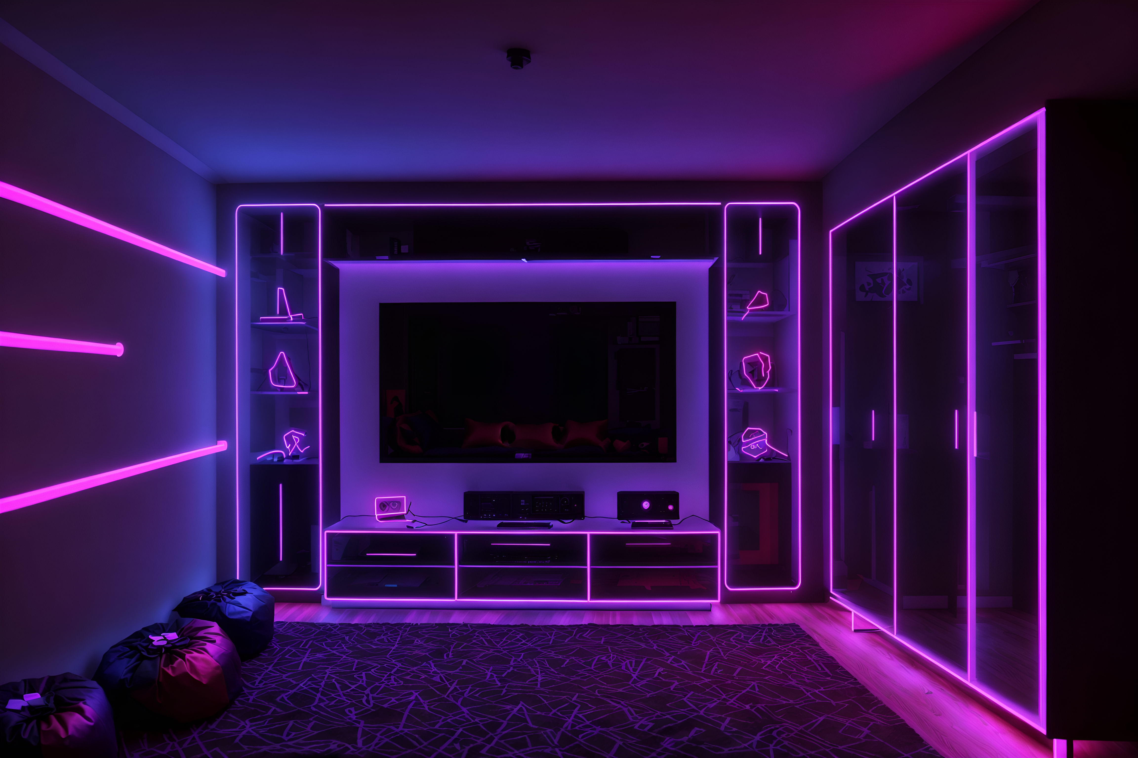 photo from pinterest of gaming room-style interior designed (walk in closet interior) . with neon letters on wall and at night and purple and red lights and speakers and purple, red and blue fade light and multiple displays and dark walls and dark room. . cinematic photo, highly detailed, cinematic lighting, ultra-detailed, ultrarealistic, photorealism, 8k. trending on pinterest. gaming room interior design style. masterpiece, cinematic light, ultrarealistic+, photorealistic+, 8k, raw photo, realistic, sharp focus on eyes, (symmetrical eyes), (intact eyes), hyperrealistic, highest quality, best quality, , highly detailed, masterpiece, best quality, extremely detailed 8k wallpaper, masterpiece, best quality, ultra-detailed, best shadow, detailed background, detailed face, detailed eyes, high contrast, best illumination, detailed face, dulux, caustic, dynamic angle, detailed glow. dramatic lighting. highly detailed, insanely detailed hair, symmetrical, intricate details, professionally retouched, 8k high definition. strong bokeh. award winning photo.