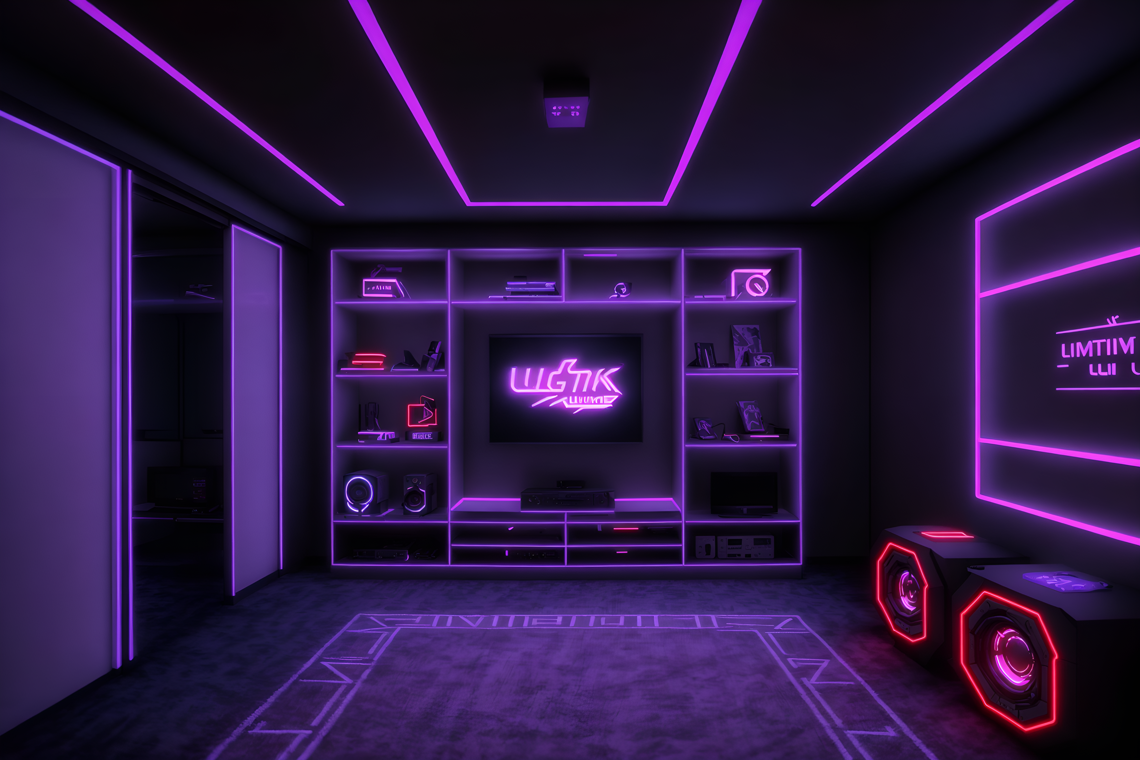photo from pinterest of gaming room-style interior designed (walk in closet interior) . with neon letters on wall and at night and purple and red lights and speakers and purple, red and blue fade light and multiple displays and dark walls and dark room. . cinematic photo, highly detailed, cinematic lighting, ultra-detailed, ultrarealistic, photorealism, 8k. trending on pinterest. gaming room interior design style. masterpiece, cinematic light, ultrarealistic+, photorealistic+, 8k, raw photo, realistic, sharp focus on eyes, (symmetrical eyes), (intact eyes), hyperrealistic, highest quality, best quality, , highly detailed, masterpiece, best quality, extremely detailed 8k wallpaper, masterpiece, best quality, ultra-detailed, best shadow, detailed background, detailed face, detailed eyes, high contrast, best illumination, detailed face, dulux, caustic, dynamic angle, detailed glow. dramatic lighting. highly detailed, insanely detailed hair, symmetrical, intricate details, professionally retouched, 8k high definition. strong bokeh. award winning photo.
