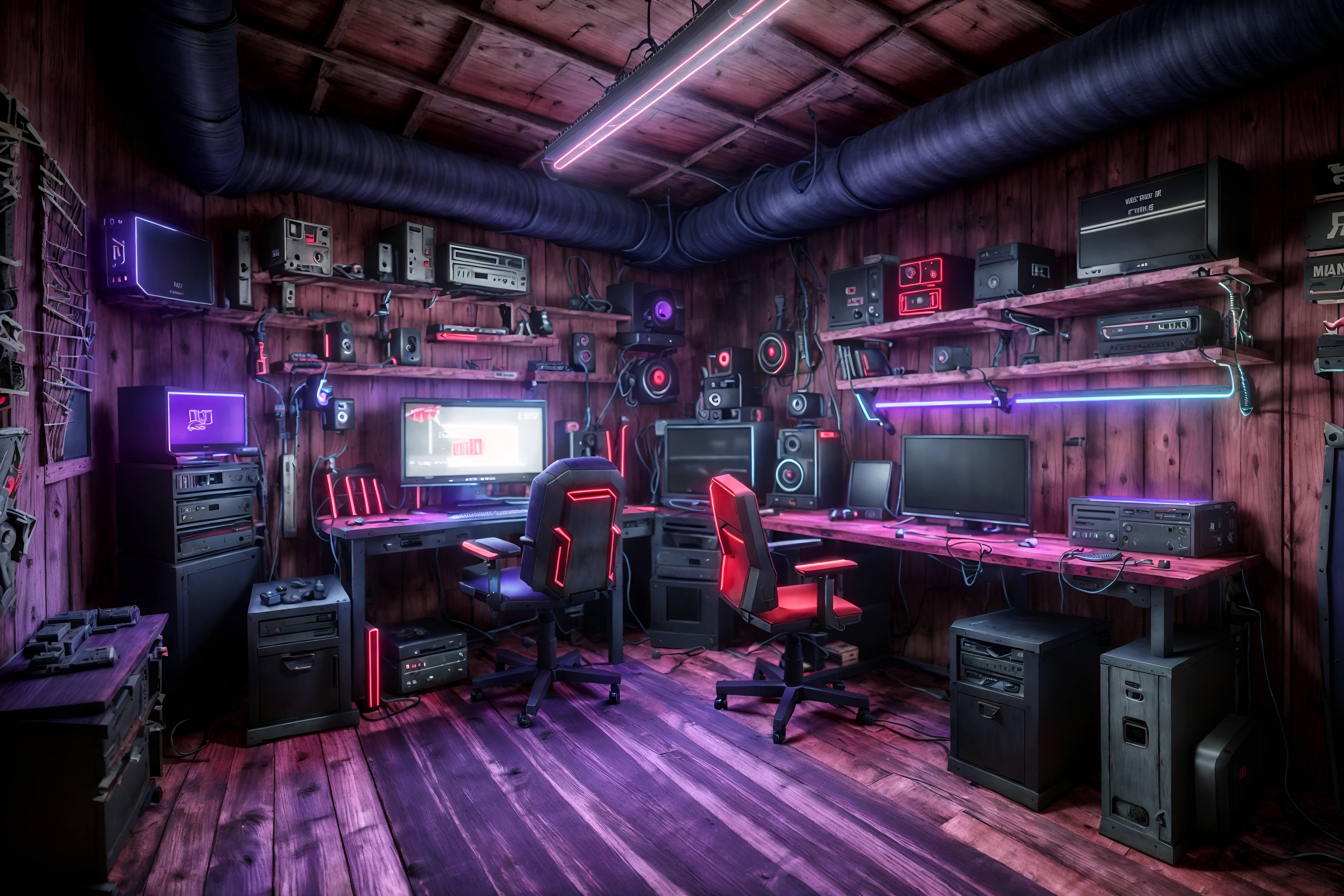 photo from pinterest of gaming room-style interior designed (workshop interior) with wooden workbench and messy and tool wall and wooden workbench. . with dark room and purple and red lights and speakers and neon letters on wall and purple, red and blue fade light and computer desk with computer displays and keyboard and multiple displays and gaming chair. . cinematic photo, highly detailed, cinematic lighting, ultra-detailed, ultrarealistic, photorealism, 8k. trending on pinterest. gaming room interior design style. masterpiece, cinematic light, ultrarealistic+, photorealistic+, 8k, raw photo, realistic, sharp focus on eyes, (symmetrical eyes), (intact eyes), hyperrealistic, highest quality, best quality, , highly detailed, masterpiece, best quality, extremely detailed 8k wallpaper, masterpiece, best quality, ultra-detailed, best shadow, detailed background, detailed face, detailed eyes, high contrast, best illumination, detailed face, dulux, caustic, dynamic angle, detailed glow. dramatic lighting. highly detailed, insanely detailed hair, symmetrical, intricate details, professionally retouched, 8k high definition. strong bokeh. award winning photo.