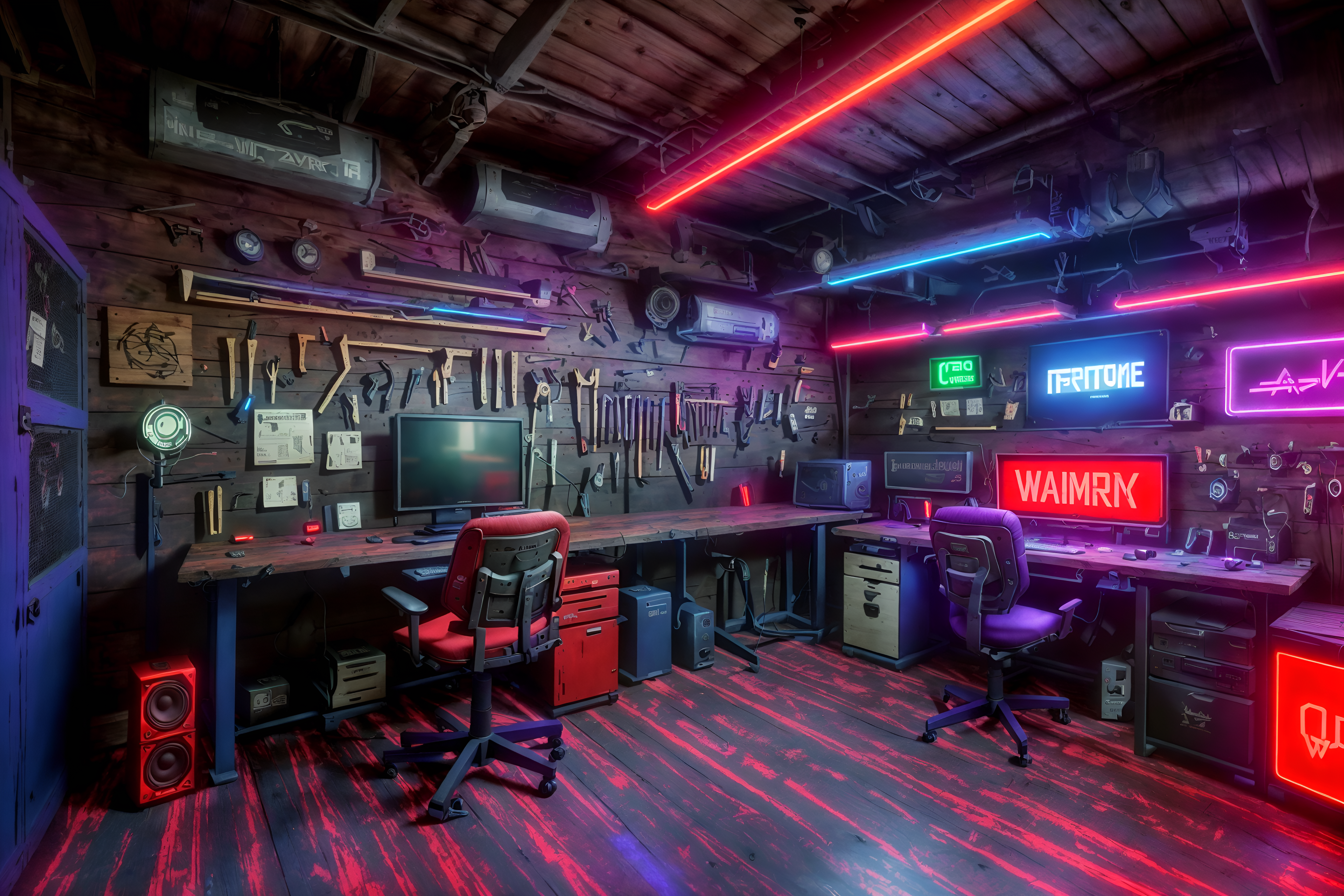 photo from pinterest of gaming room-style interior designed (workshop interior) with wooden workbench and messy and tool wall and wooden workbench. . with dark room and purple and red lights and speakers and neon letters on wall and purple, red and blue fade light and computer desk with computer displays and keyboard and multiple displays and gaming chair. . cinematic photo, highly detailed, cinematic lighting, ultra-detailed, ultrarealistic, photorealism, 8k. trending on pinterest. gaming room interior design style. masterpiece, cinematic light, ultrarealistic+, photorealistic+, 8k, raw photo, realistic, sharp focus on eyes, (symmetrical eyes), (intact eyes), hyperrealistic, highest quality, best quality, , highly detailed, masterpiece, best quality, extremely detailed 8k wallpaper, masterpiece, best quality, ultra-detailed, best shadow, detailed background, detailed face, detailed eyes, high contrast, best illumination, detailed face, dulux, caustic, dynamic angle, detailed glow. dramatic lighting. highly detailed, insanely detailed hair, symmetrical, intricate details, professionally retouched, 8k high definition. strong bokeh. award winning photo.