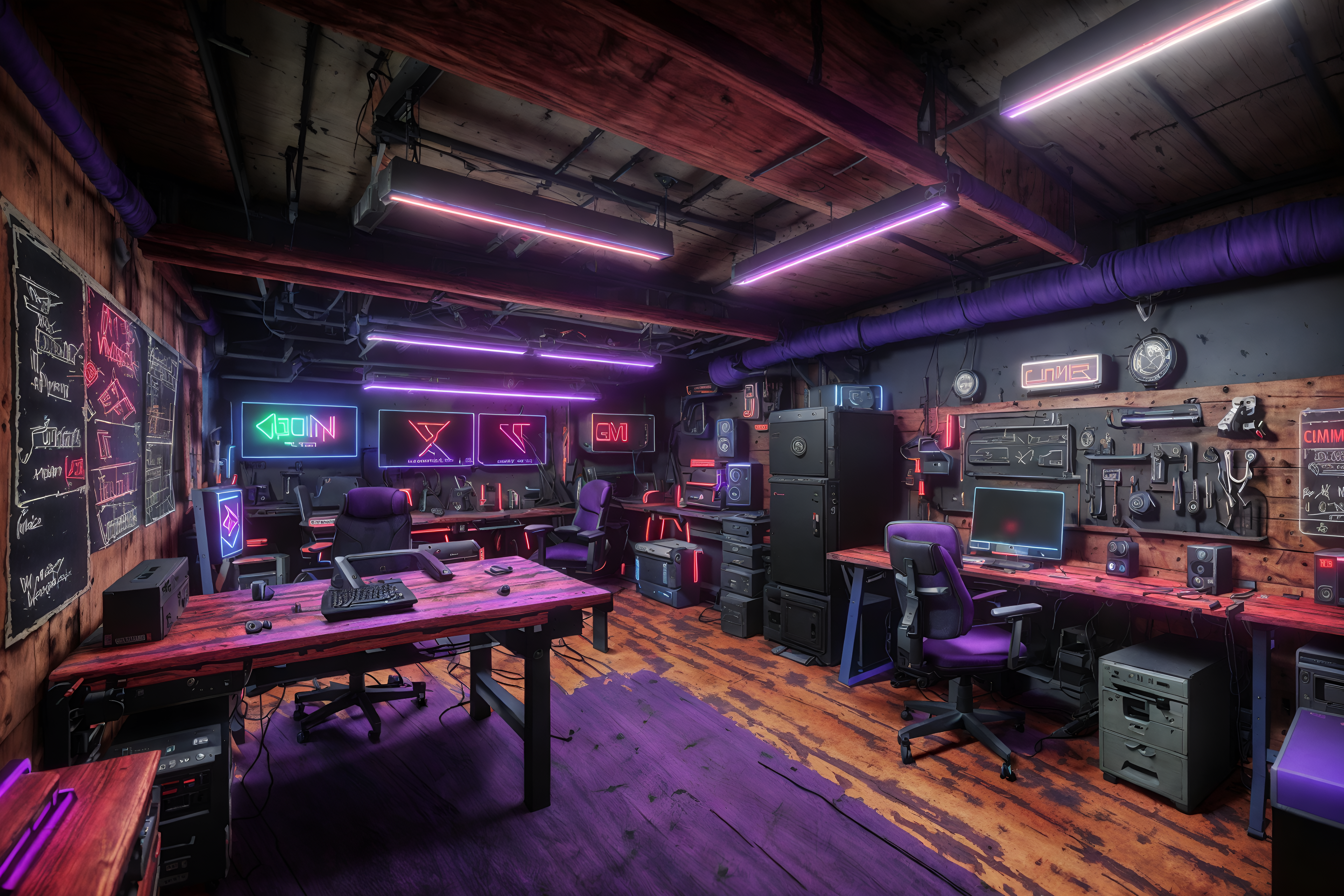 gaming room workshopsinterior decorate this workshop with gaming room style. . . with tool wall and messy and wooden workbench and tool wall. . with dark walls and purple, red and blue fade light and computer desk with computer displays and keyboard and dark room and neon letters on wall and at night and gaming chair and speakers. . .