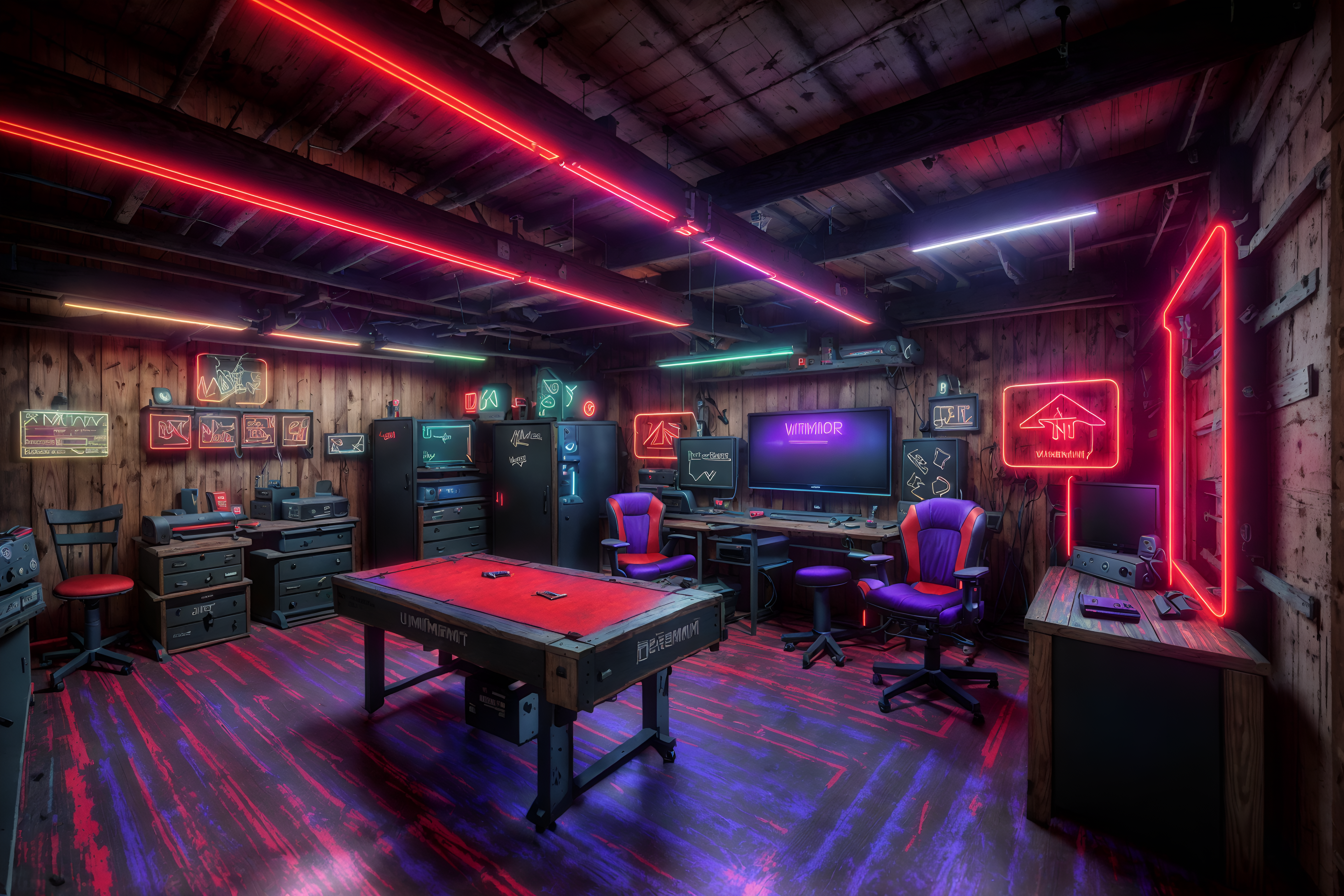 photo from pinterest of gaming room-style interior designed (workshop interior) with wooden workbench and messy and tool wall and wooden workbench. . with dark room and purple and red lights and speakers and neon letters on wall and purple, red and blue fade light and computer desk with computer displays and keyboard and multiple displays and gaming chair. . cinematic photo, highly detailed, cinematic lighting, ultra-detailed, ultrarealistic, photorealism, 8k. trending on pinterest. gaming room interior design style. masterpiece, cinematic light, ultrarealistic+, photorealistic+, 8k, raw photo, realistic, sharp focus on eyes, (symmetrical eyes), (intact eyes), hyperrealistic, highest quality, best quality, , highly detailed, masterpiece, best quality, extremely detailed 8k wallpaper, masterpiece, best quality, ultra-detailed, best shadow, detailed background, detailed face, detailed eyes, high contrast, best illumination, detailed face, dulux, caustic, dynamic angle, detailed glow. dramatic lighting. highly detailed, insanely detailed hair, symmetrical, intricate details, professionally retouched, 8k high definition. strong bokeh. award winning photo.