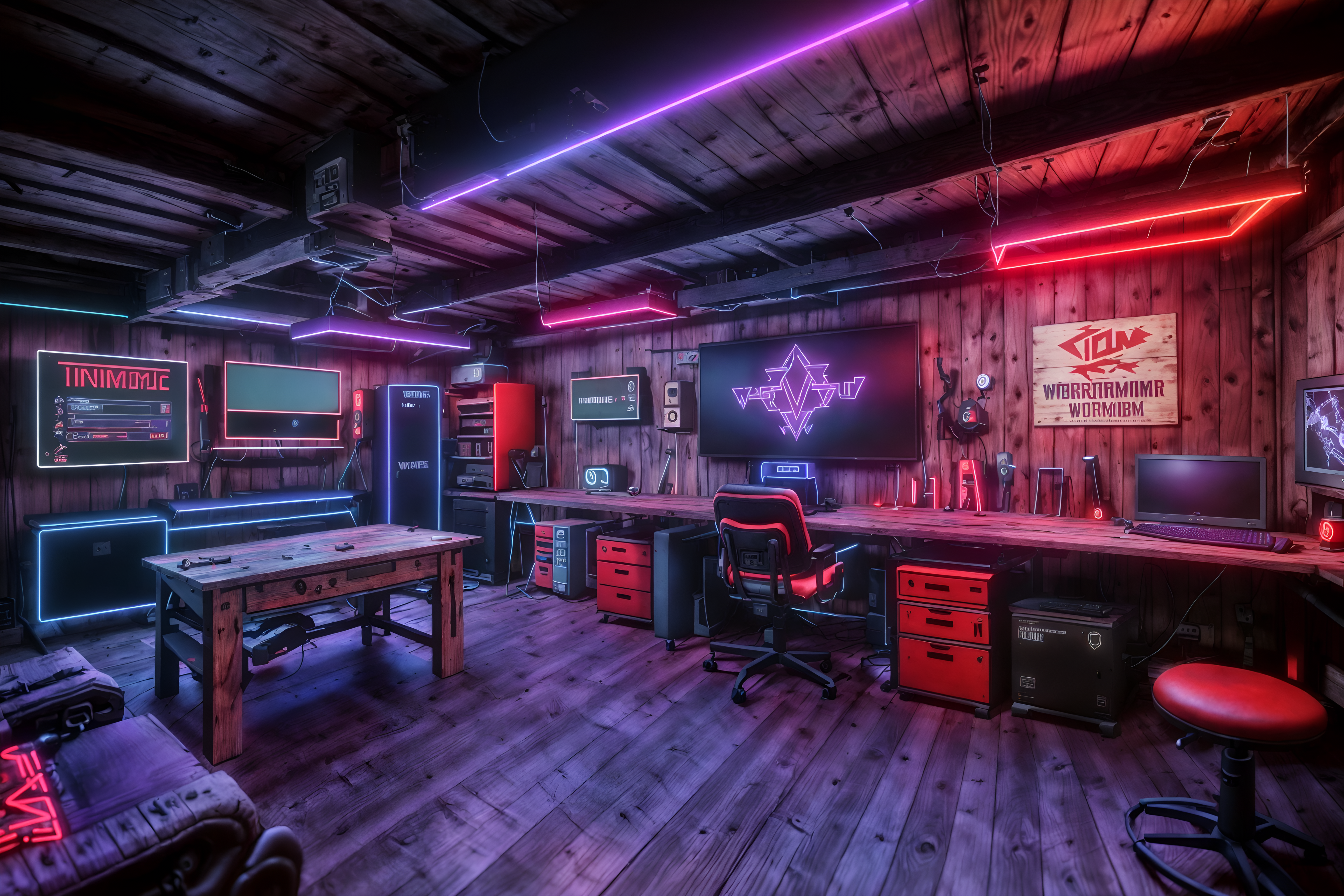 gaming room workshopsinterior decorate this workshop with gaming room style. . . with tool wall and messy and wooden workbench and tool wall. . with dark walls and purple, red and blue fade light and computer desk with computer displays and keyboard and dark room and neon letters on wall and at night and gaming chair and speakers. . .