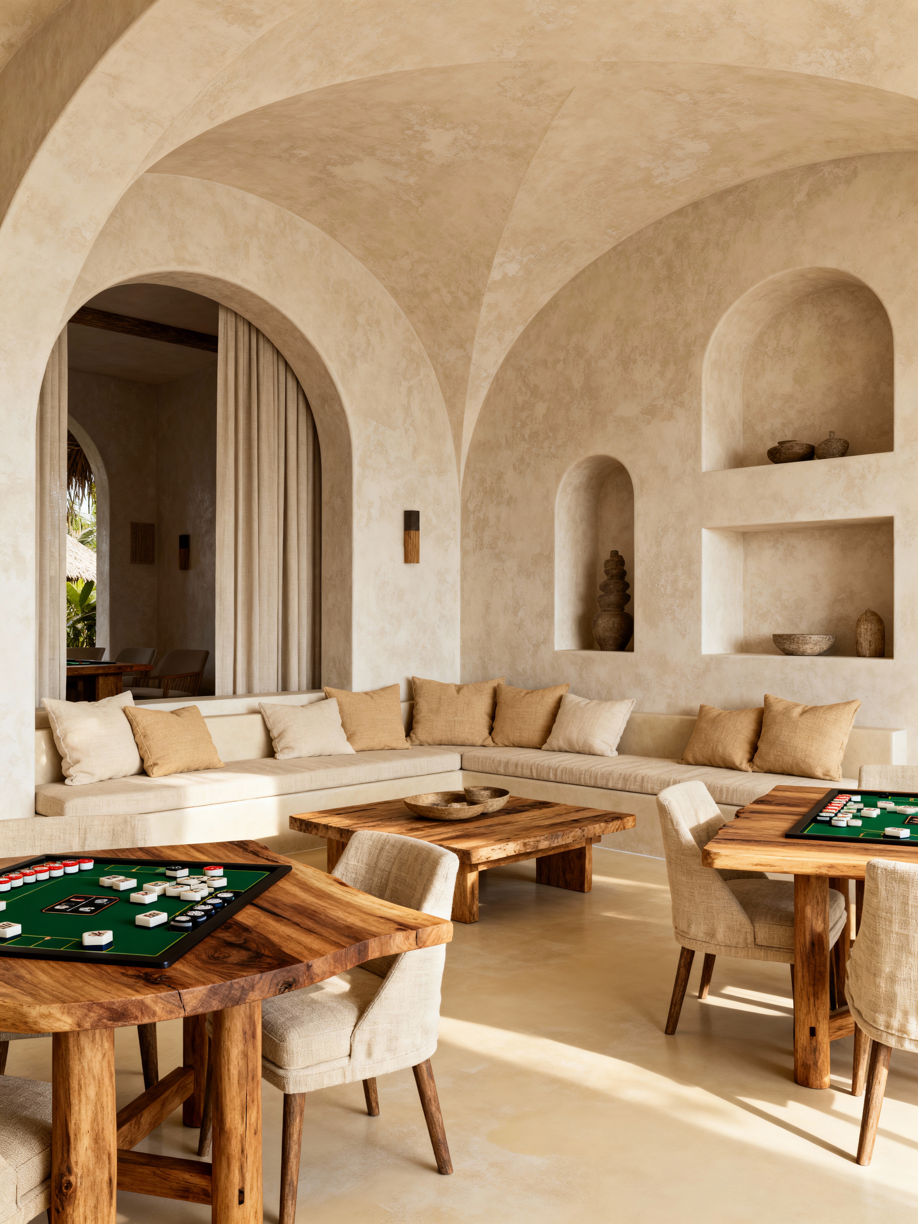 gaming room with bali style . with wooden coffee and dining tables and linen or cotton fabrics and modern boho chic and microcement floors and conversation pit with pillows and beige and sand tone cushions and textured plaster or stucco finish and arched walls and niches