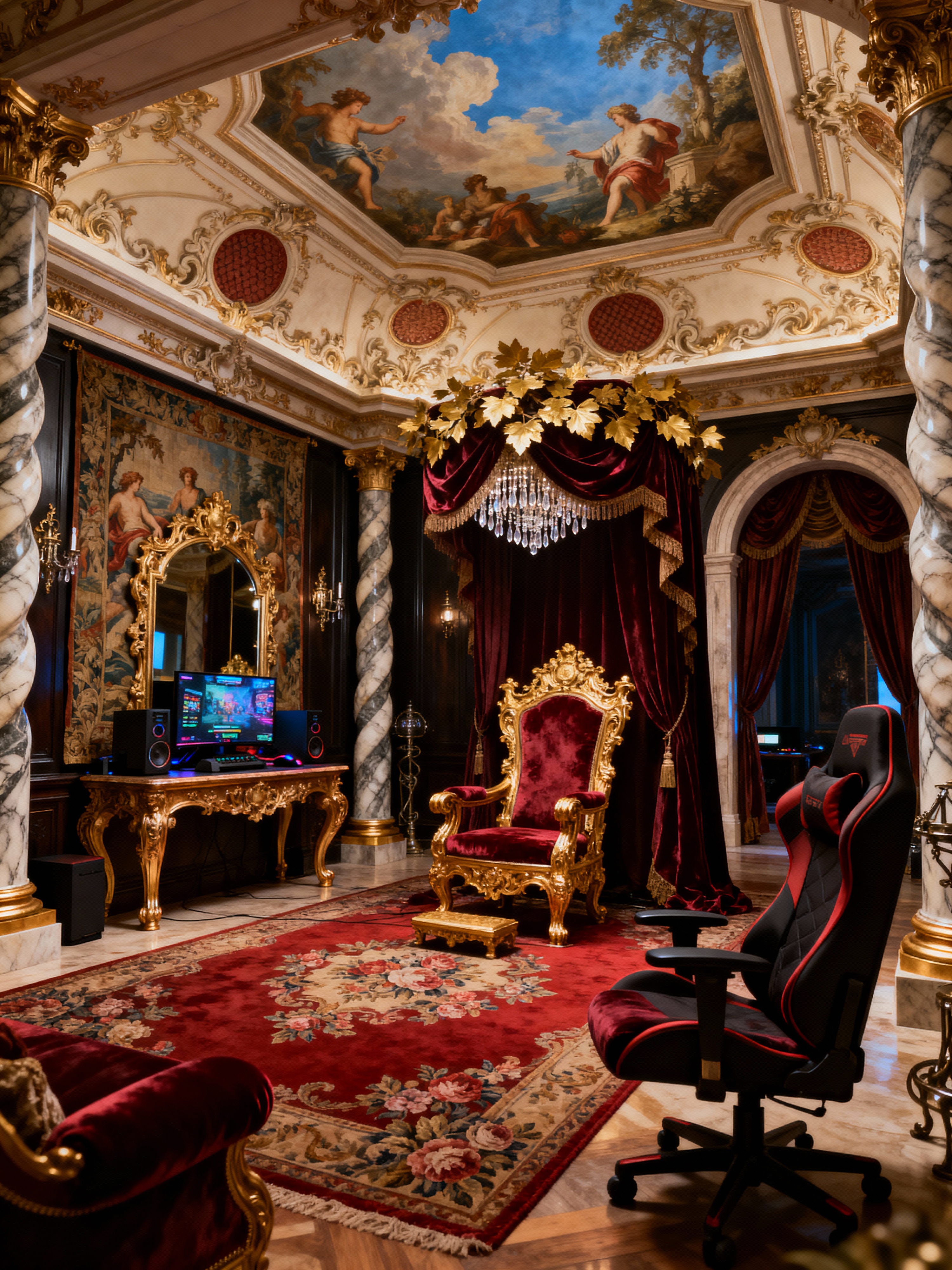 gaming room with baroque style . with heavy moldings and grandeur and drama and twisted columns and tension and intricate carvings and ornaments and sensuous richness and dynamism