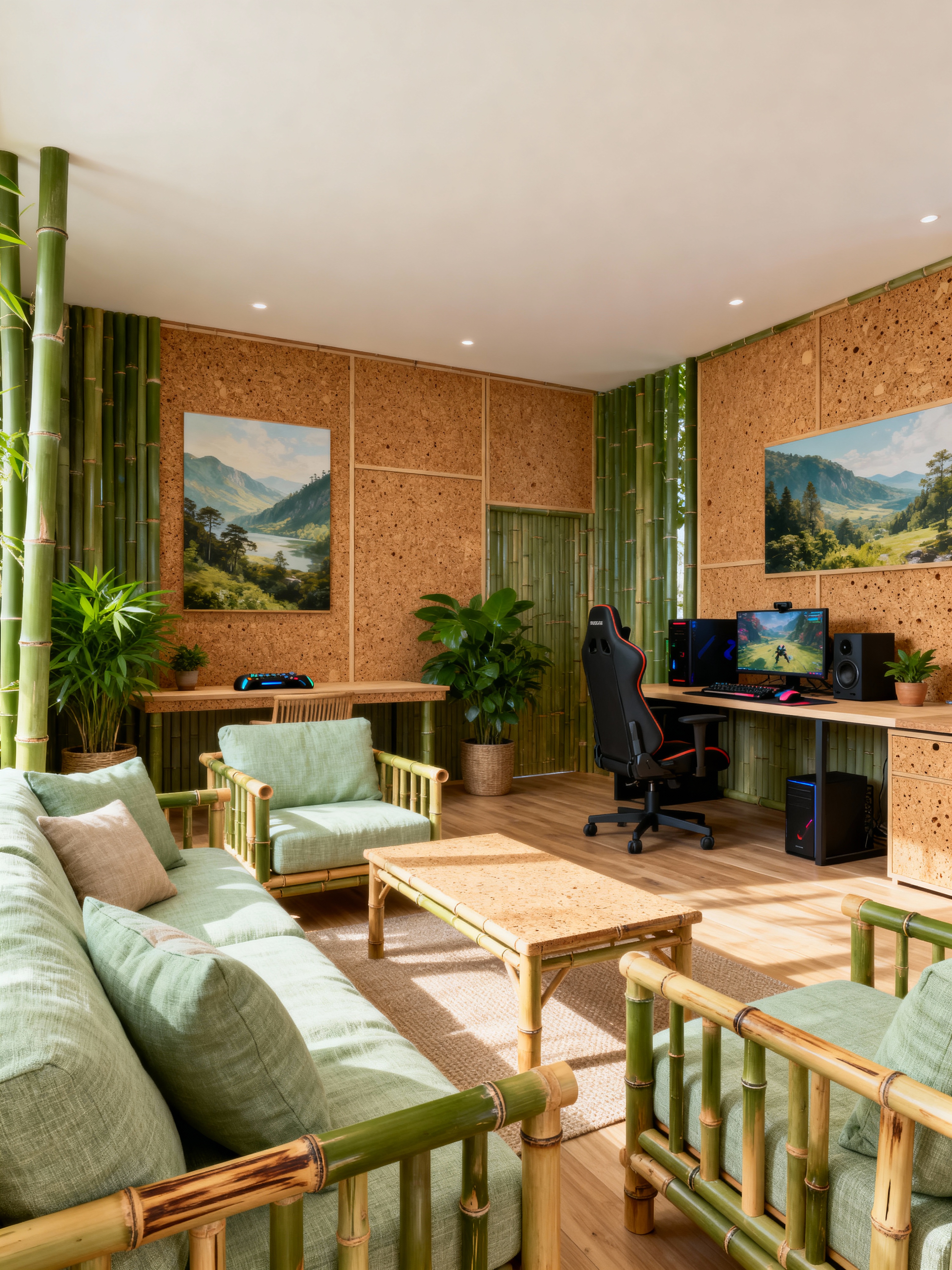 gaming room with biophilic style . with natural elements and bamboo materials and features of nature and linen materials and calming style and images of nature and fresh air and cork materials