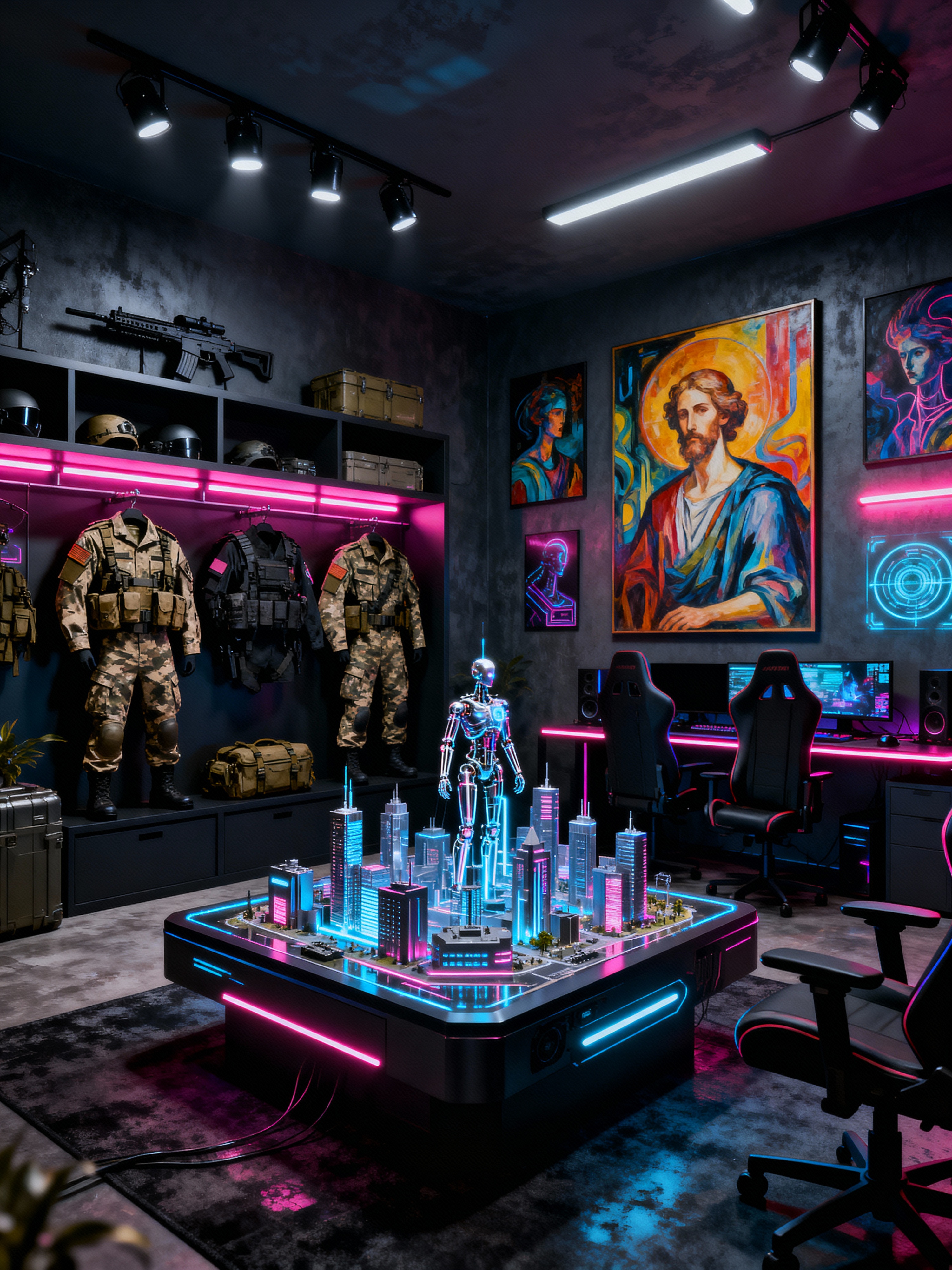 gaming room with cyberpunk style . with surrealist paintings and cyberpunk lights and black lights and bladerunner lights and military uniforms and gear and futuristic cybernetic city and cyberpunk style and futuristic cybernetic details