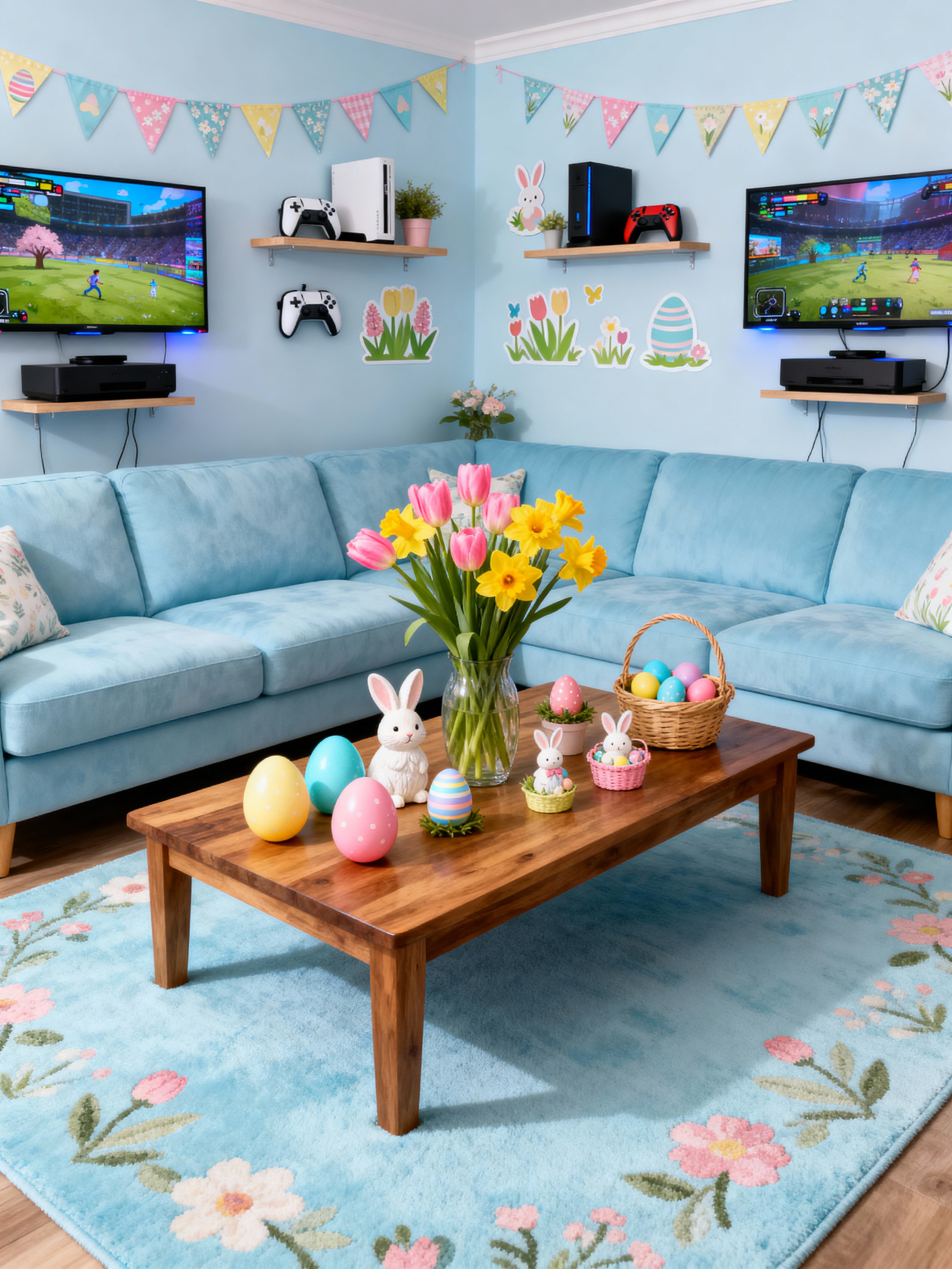 gaming room with easter style . with easter decorations and flowers on table and spring decorations and light blue colors and colorful easter eggs and easter decorations