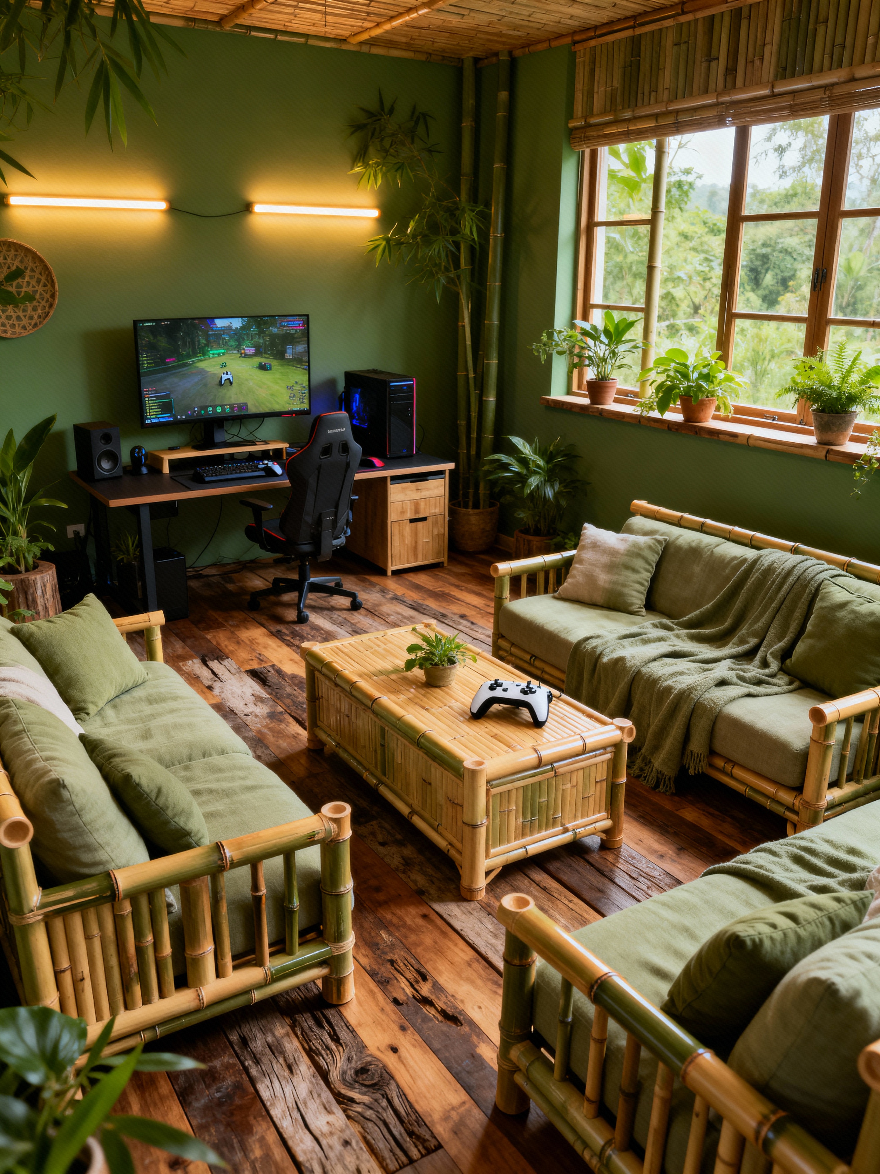 gaming room with eco-friendly style . with bamboo furniture and environmentally conscious and organic textiles and reclaimed wood and green living and energy efficient and non-toxic finishes and sustainable materials