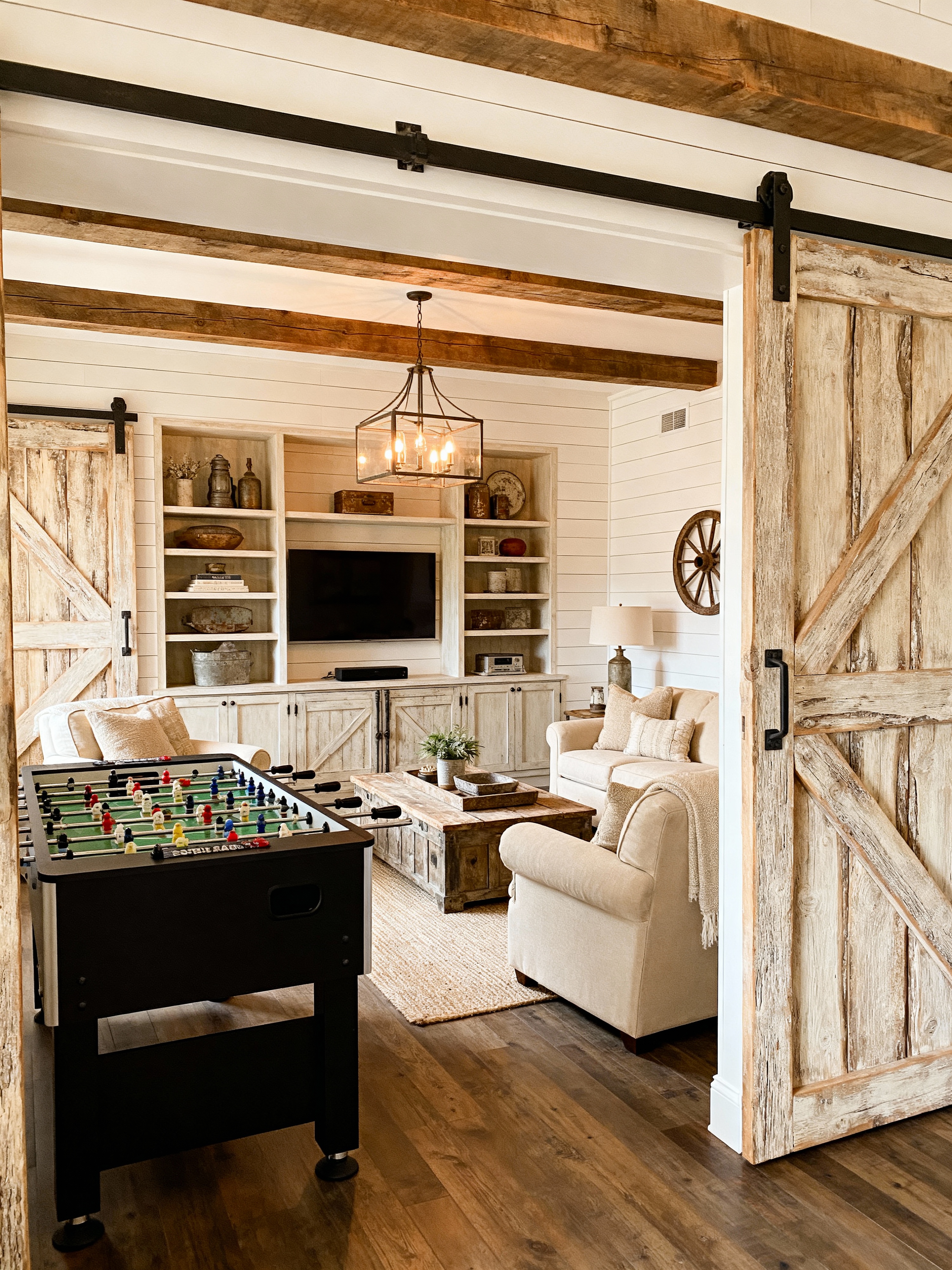 gaming room with farmhouse style . with shiplap walls and exposed wood and country style and vintage decor and open shelving and neutral tones and barn doors and natural textures