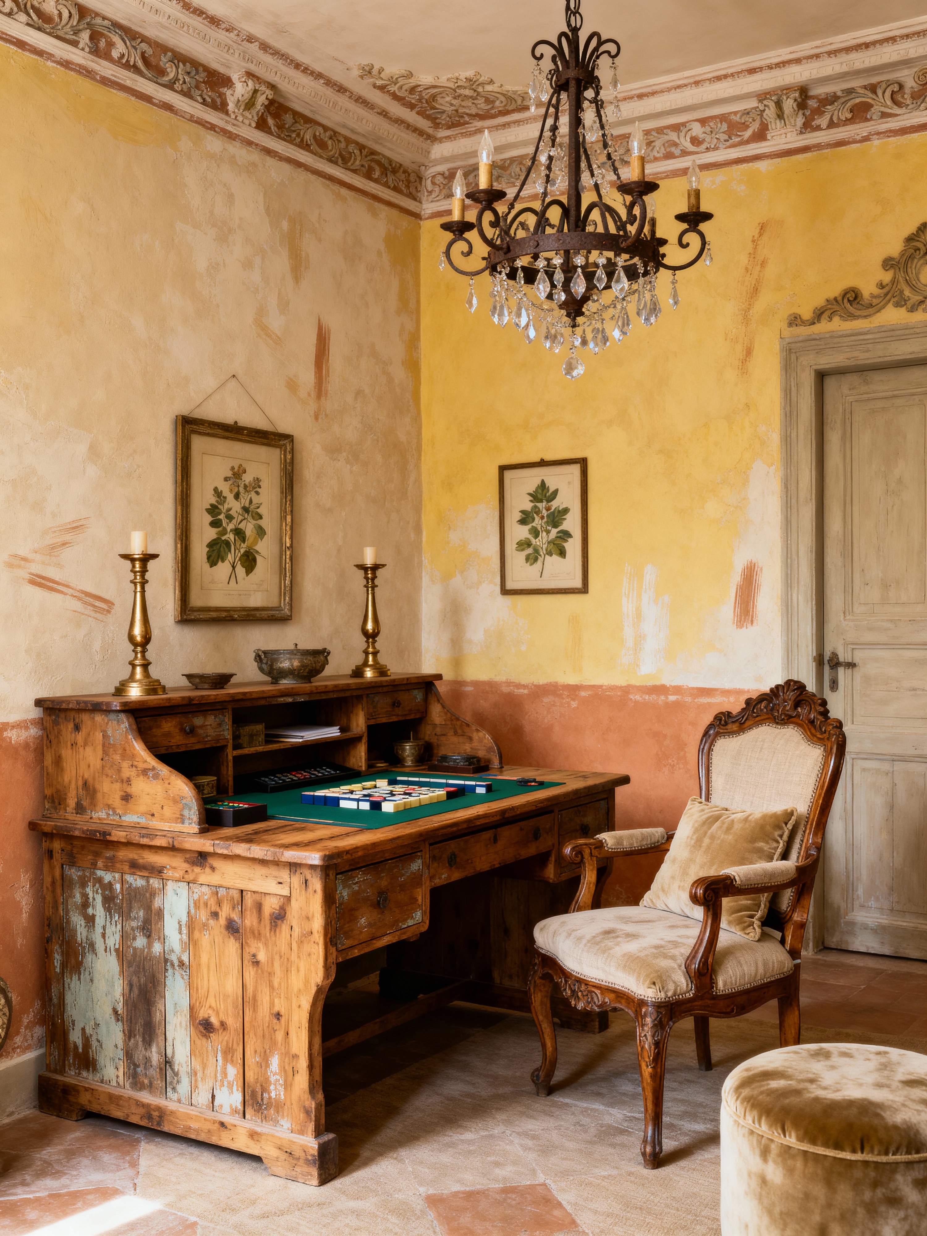 gaming room with french country style . with textured walls and vintage furniture and elegant rustic and chandeliers and ornate details and soft fabrics and antique decor and distressed wood