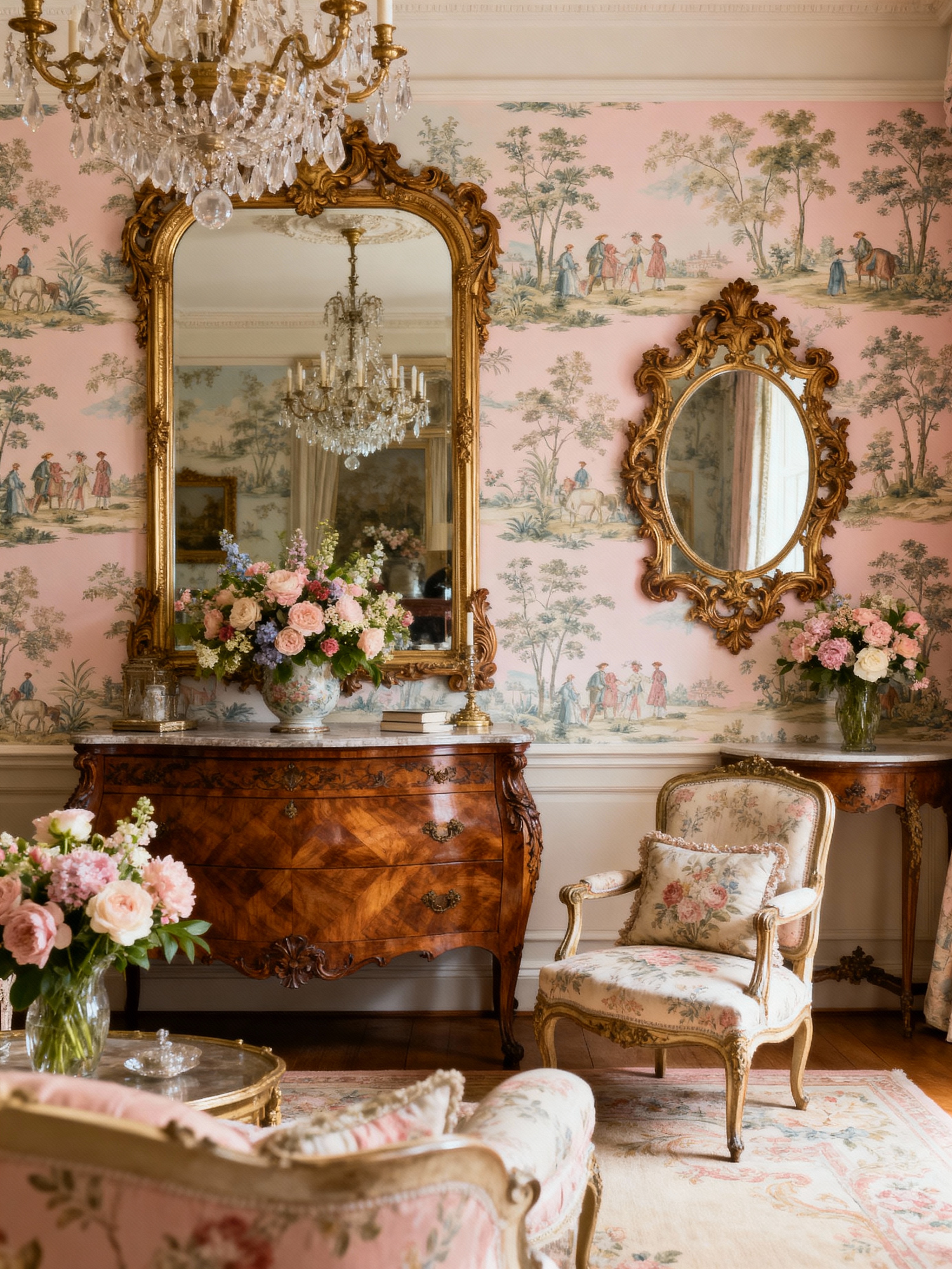 gaming room with french style . with provincial charm and toile patterns and elegant details and antique pieces and romantic style and ornate furniture and classic beauty and sophisticated grace