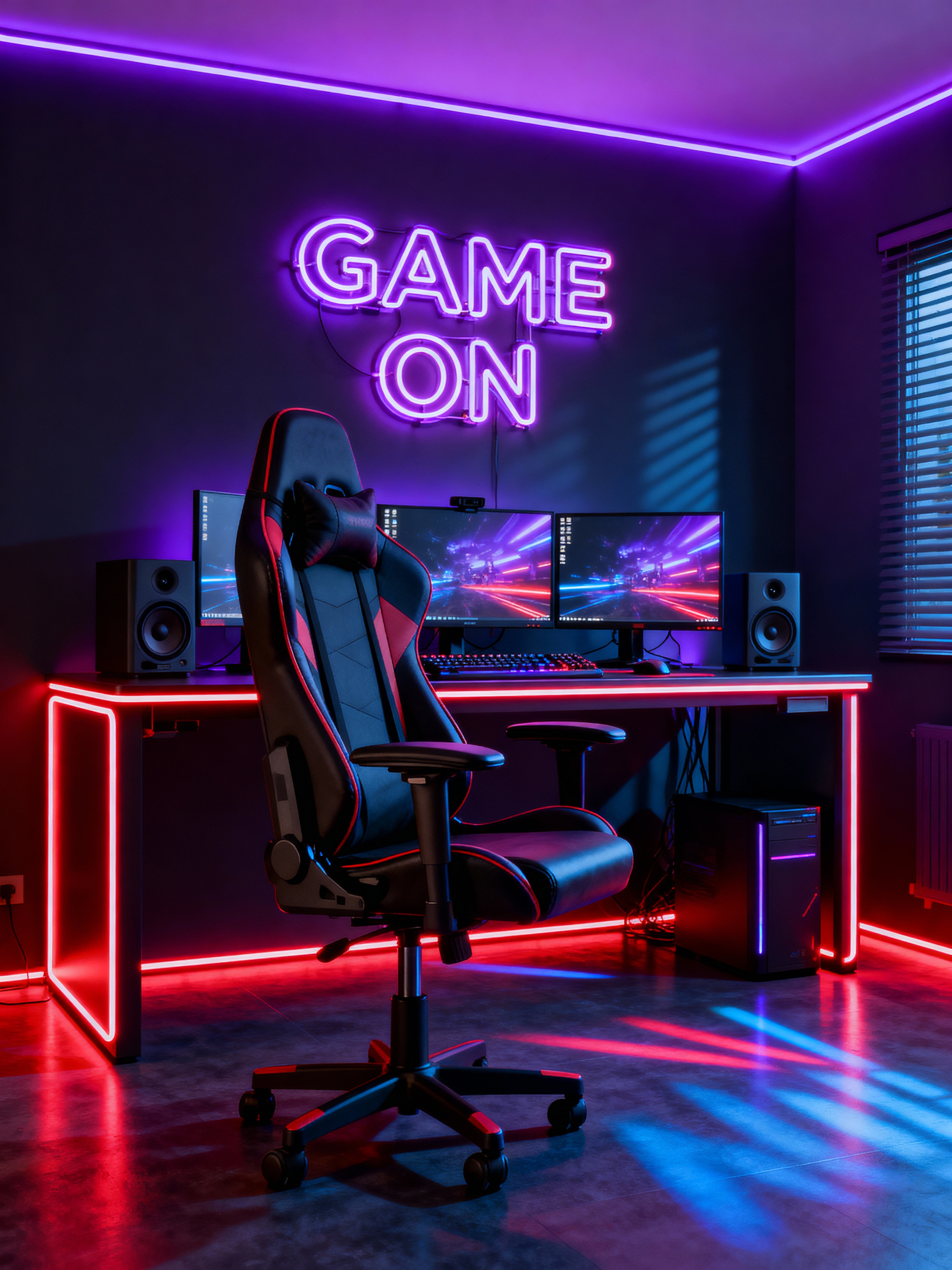 gaming room with gaming room style . with gaming chair and at night and neon letters on wall and computer desk with computer displays and keyboard and dark walls and speakers and neon lights and purple and red lights