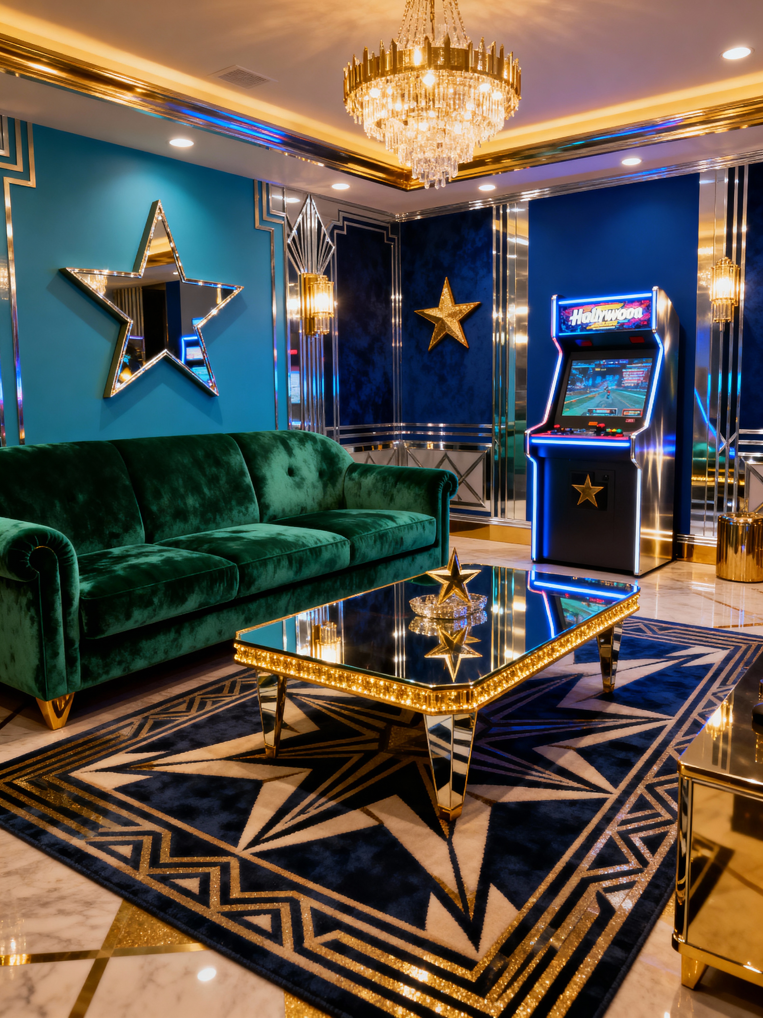 gaming room with hollywood glam style . with art deco influence and glamorous style and mirrored surfaces and velvet upholstery and bold colors and star quality and dramatic lighting and metallic accents