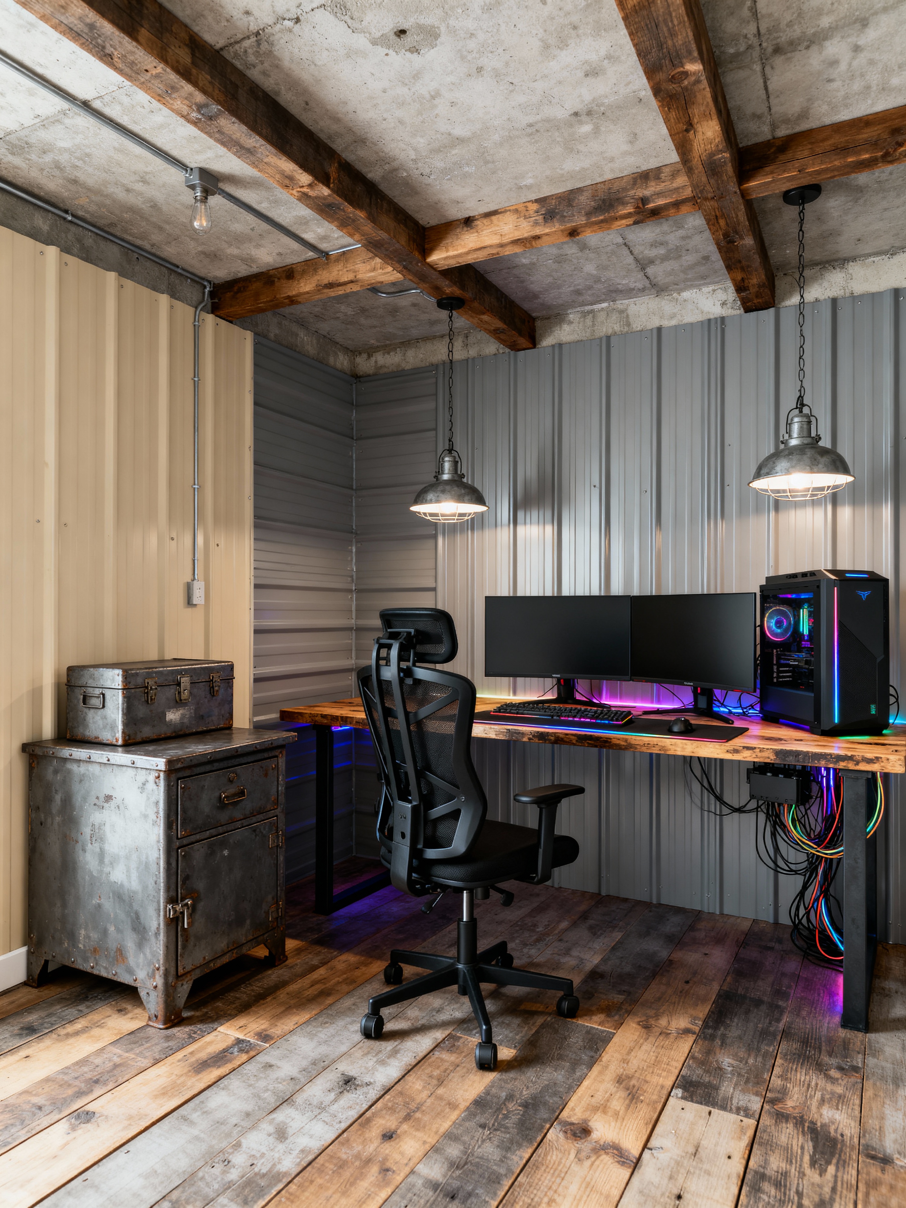 gaming room with industrial style . with metal panels and exposed rafters and factory style and neutral tones and open floorplan and reclaimed wood and utilitarian objects and exposed concrete
