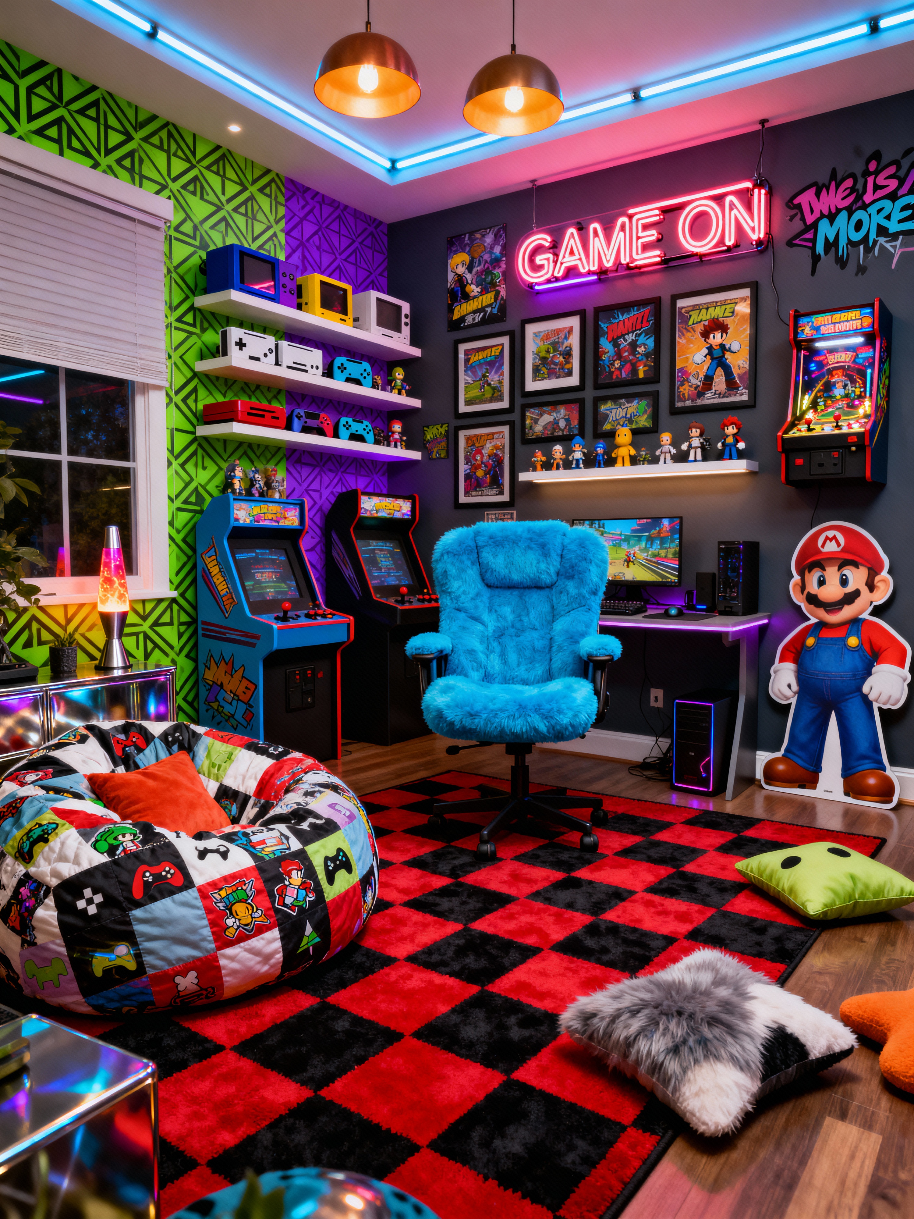 gaming room with maximalist style . with playful and more is more philosophy and over-the-top aesthetic and bold patterns and vibrant and bold design and eye-catching and bold creativity