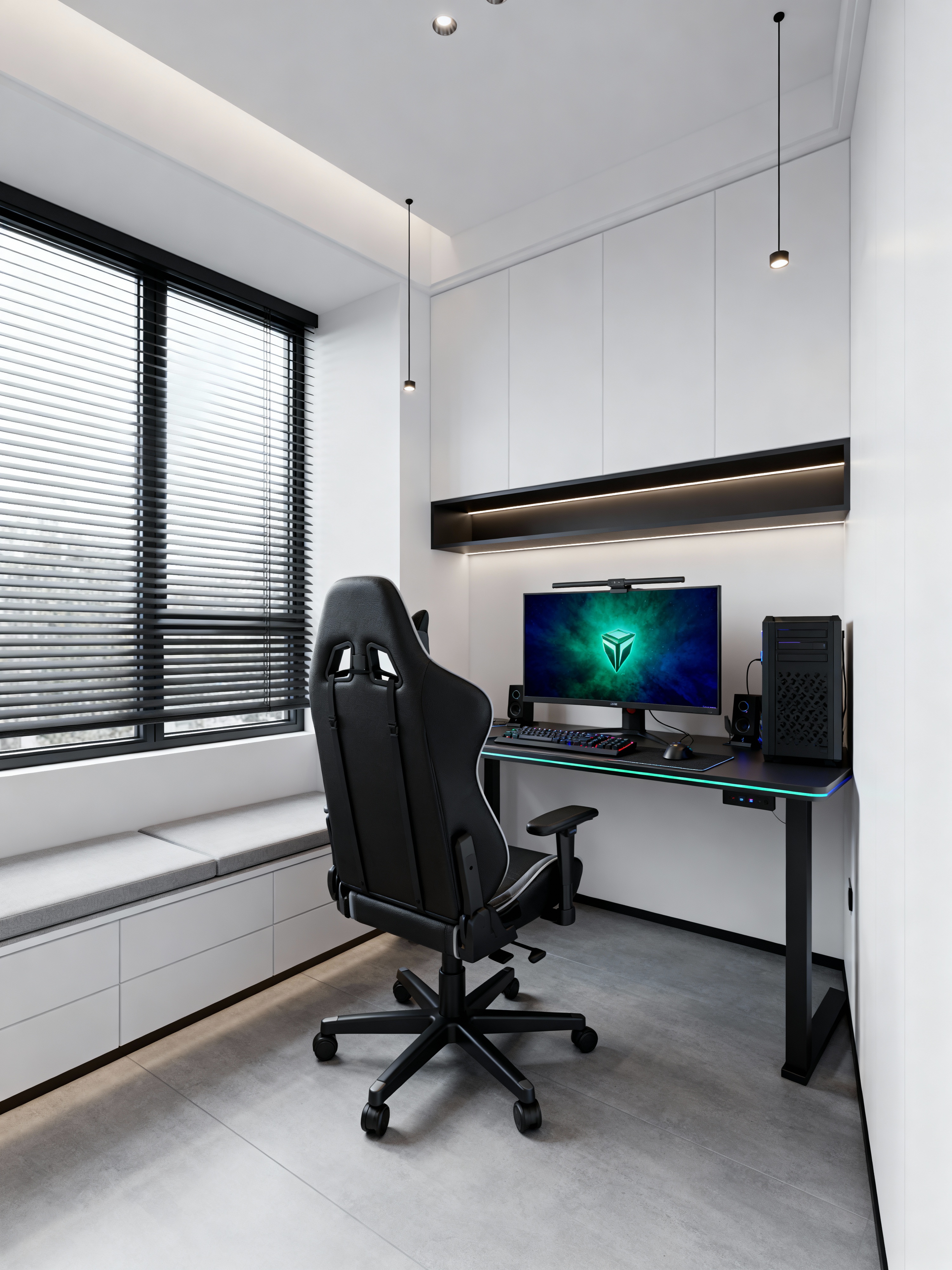 gaming room with minimalist style . with lots of light and clean lines and an open floor plan and a monochromatic palette with colour used as an accent and functional furniture and focus on the shape, colour and texture of just a few of essential elements and lots of light