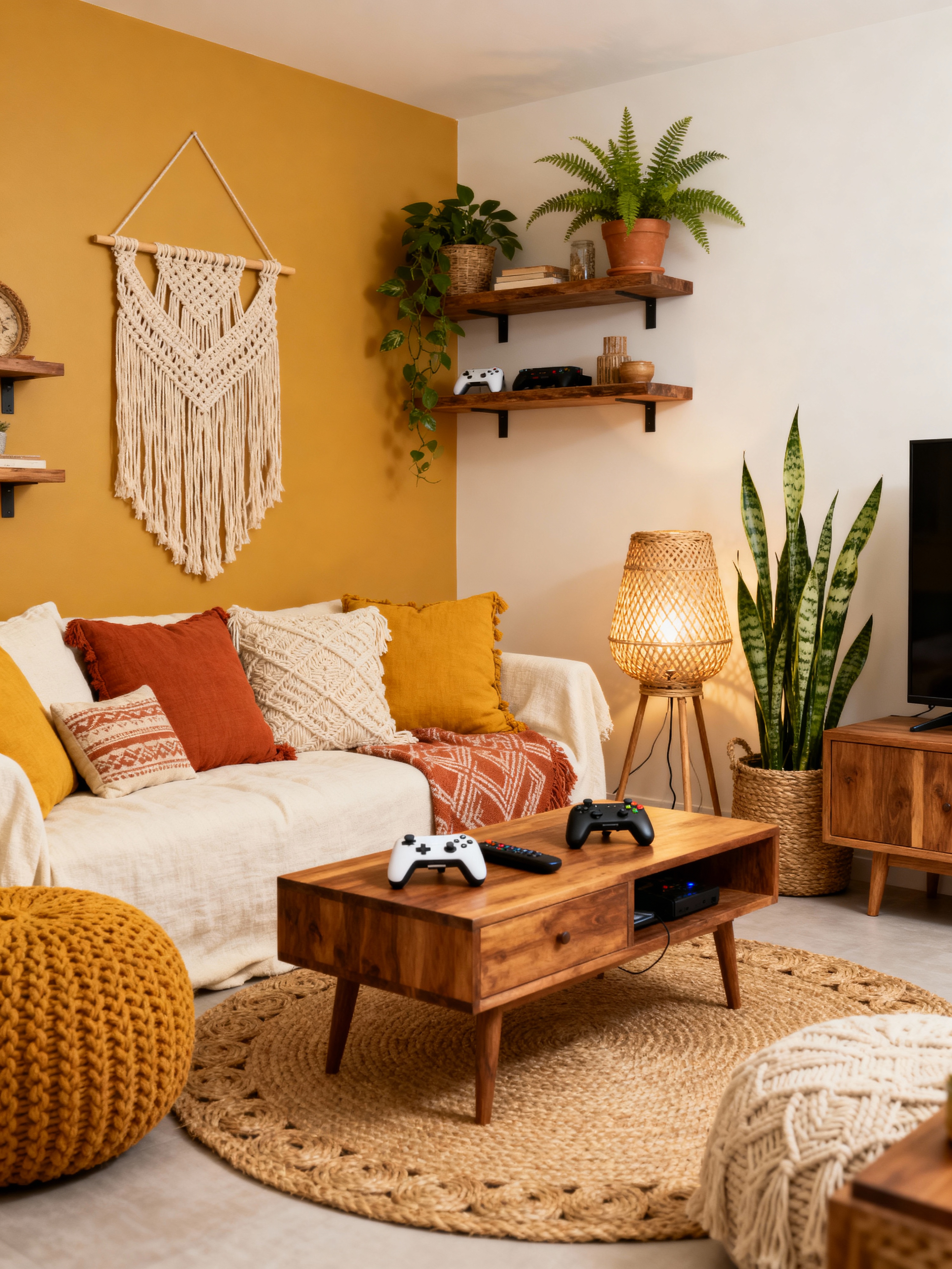 gaming room with modern boho style . with collected look and warm colors and comfortable and cotton textiles and linen fabric and wood decor and woven textures and greenery
