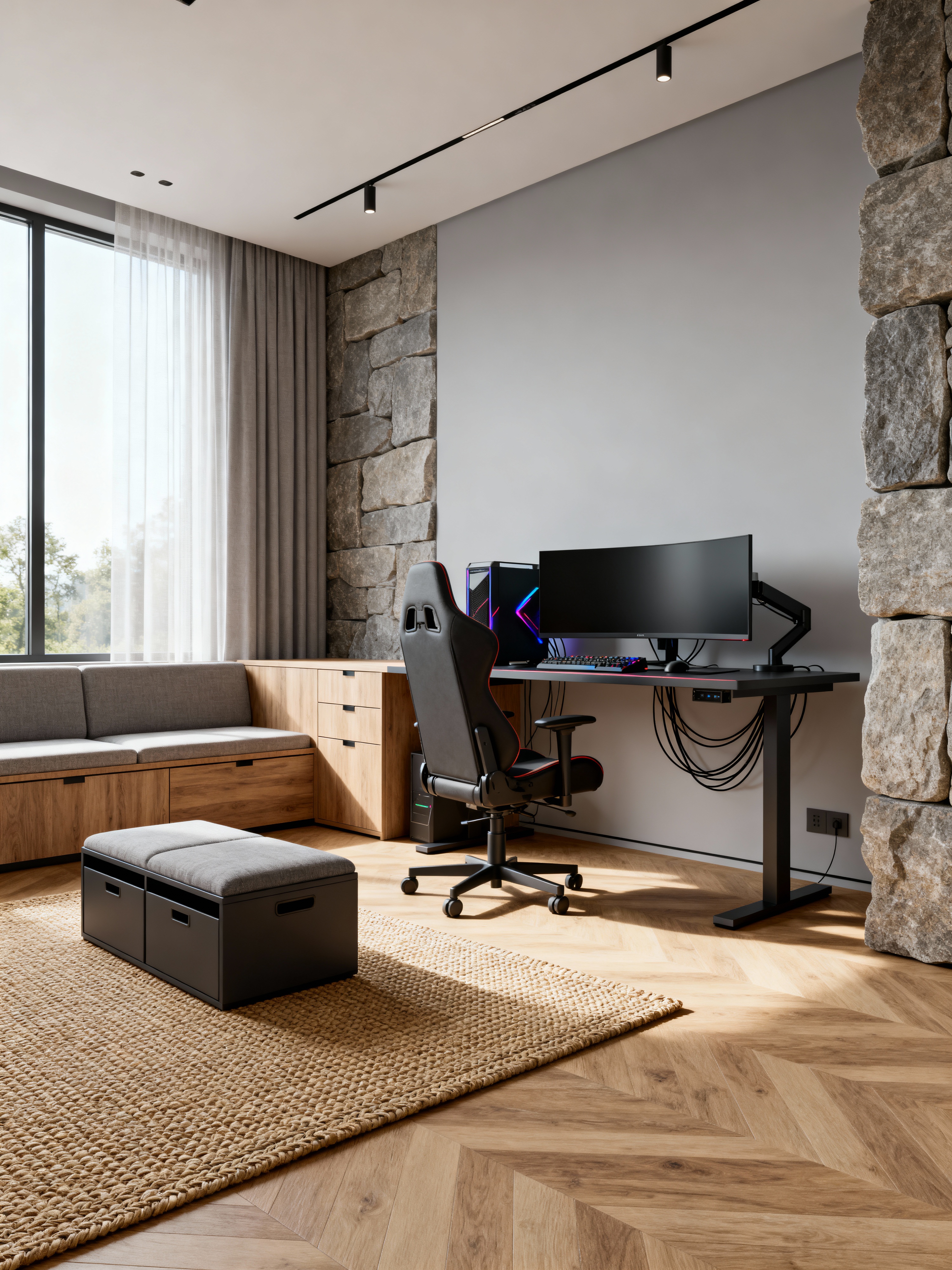 gaming room with modern style . with simple, clean lines and simplistic furniture and open and natural lighting and natural materials and elements and practicality and functionality and neutral walls and textures and simple, clean lines and simplistic furniture