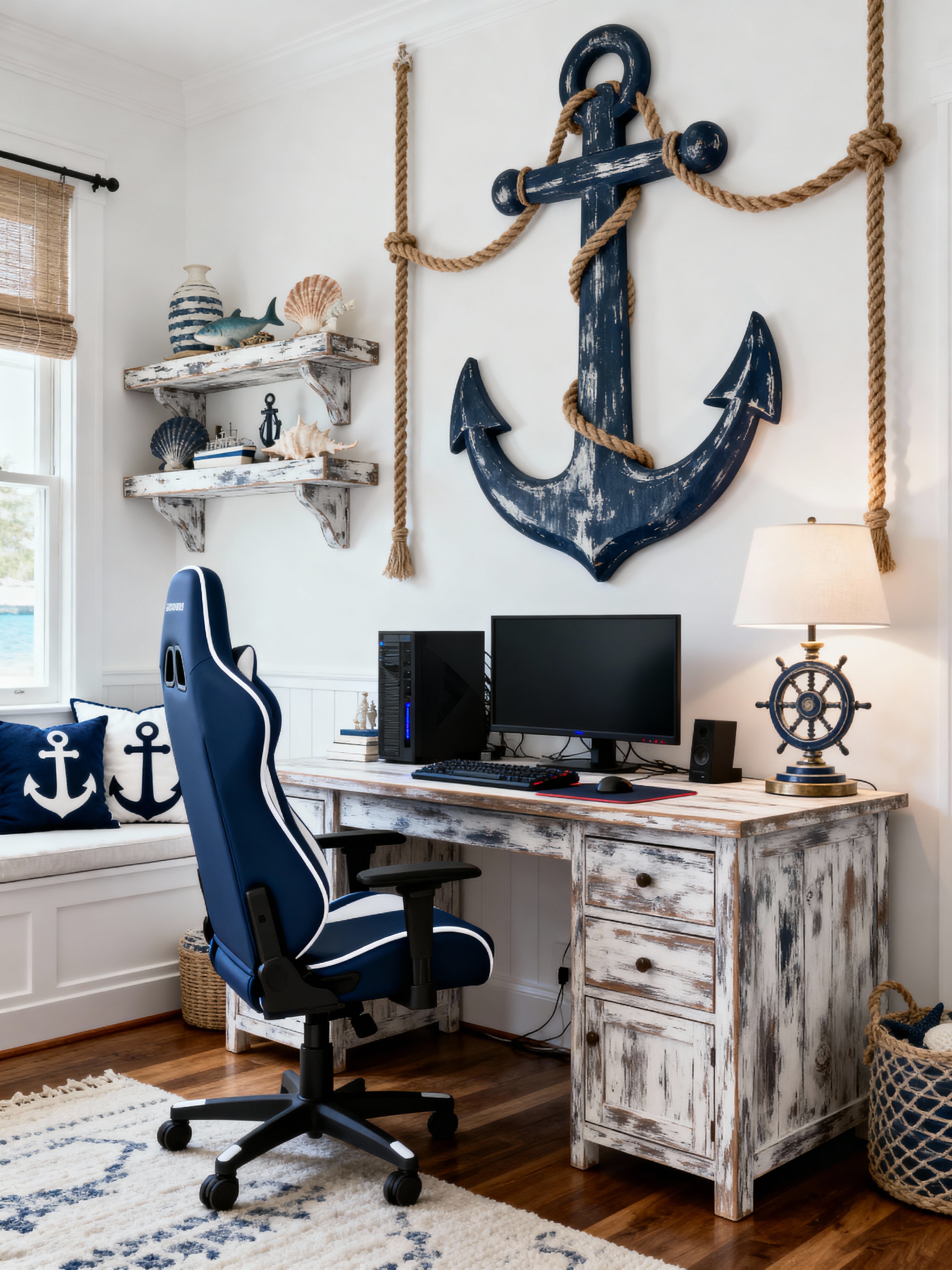 gaming room with nautical style . with maritime decor and coastal vibes and weathered wood and ocean inspiration and anchor motifs and navy blue and seaside charm and crisp white